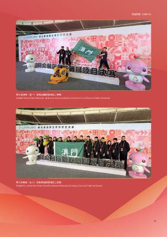 校園動態 CAMPUS 學生黃澤榮(右一)勇奪南獅障礙項目二等獎 Student Wong Chak Weng (far right) secures second place in Southern Lion Dance at National Games 學生余樂琪(左六)勇奪舞龍障礙項目三等獎 Student U Lok Kei (sixth from the left) achieves third place in Dragon Dance at National Games 53