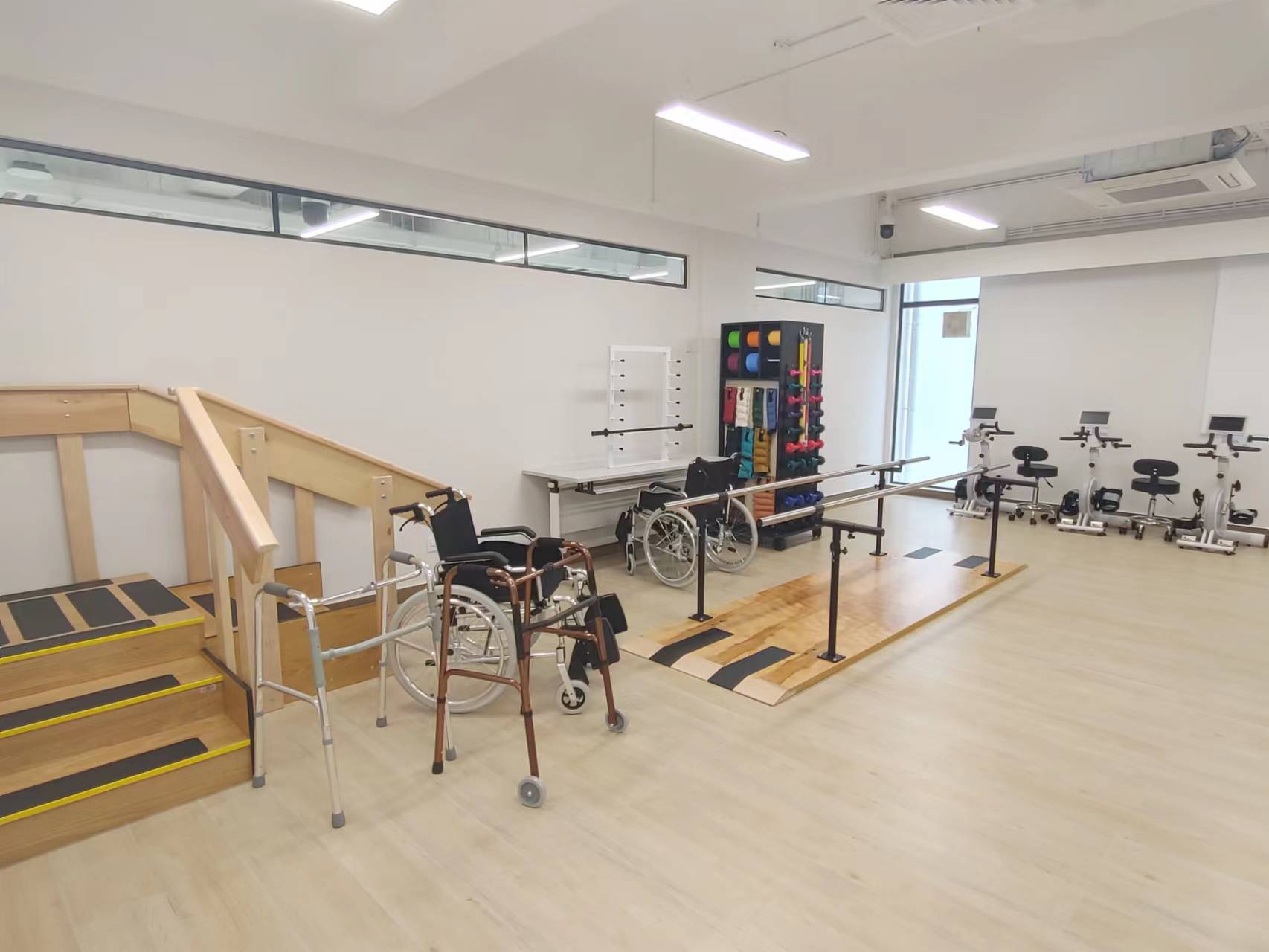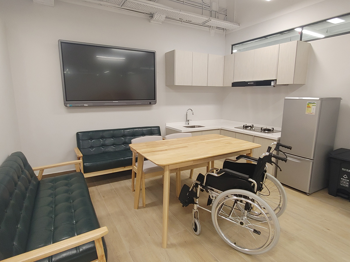 The Community and Rehabilitation Laboratory simulates the home environment of rehabilitation persons, allowing nursing students to practice how to take care of rehabilitation clients at home through simulation. On the other side, there are walking stairs, climbing frames, walking training frames, electronic bicycles, etc., so that students can master the basic knowledge and skills of physical therapy and traditional rehabilitation.