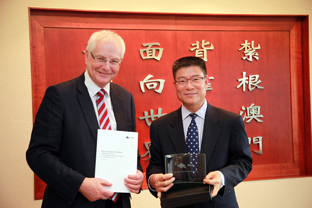 Dr Stephen Jackson and Ms Jane Holt, Director and Deputy Director respectively of the Reviews Group of the Quality Assurance Agency (QAA) for Higher Education, UK, visited Macao Polytechnic Institute (MPI) on 16 April 2014, presenting the institutional review report to MPI and expressing their congratulations over the successful Institutional Review (IR) that MPI has recently undertaken. During the visit, Dr Jackson noted MPI’s systematic way of developing its quality assurance systems and practices and the constructive arrangements made during the review visit, which enabled the review group to gain a better understanding of the Institute.