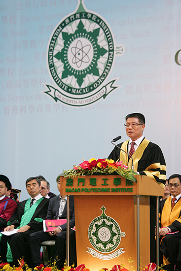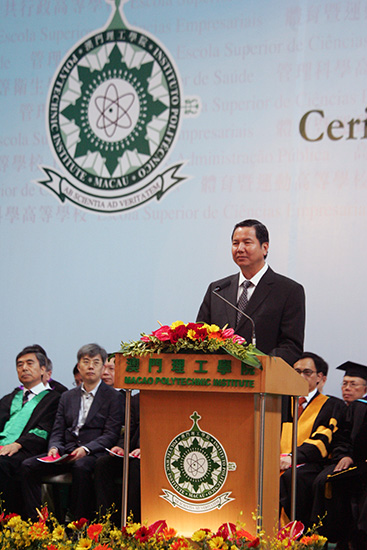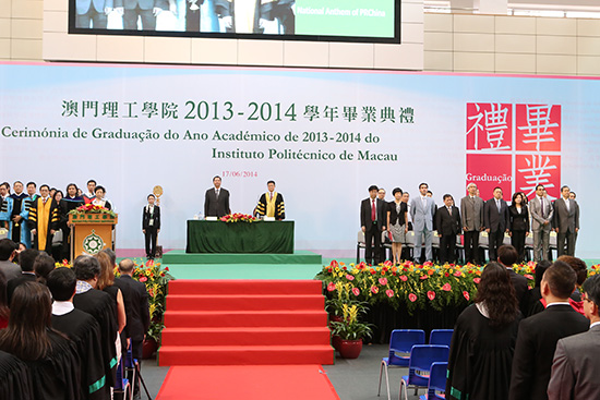 On Tuesday, 17 June 2014, presided over by the Representative of Chief Executive of Macao S.A.R., Secretary for Social Affairs and Culture Mr Cheong U and the President of Macao Polytechnic Institute Professor Lei Heong Iok, Macao Polytechnic Institute held its 2013-2014 Graduation Ceremony with nearly 600 graduates, awarded with the Outstanding Performance Awards and the bachelor’s degree. Mr Cai Siping, Deputy Commissioner of the Ministry of Foreign Affairs of China, representatives of the Executive Council, some members of the Legislative Assembly and a number of guests attended the ceremony.