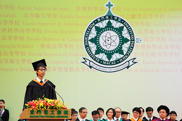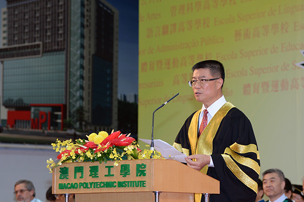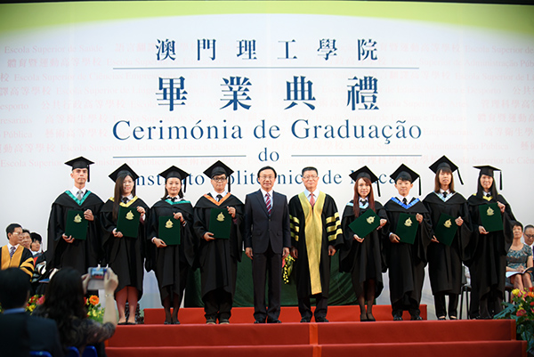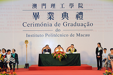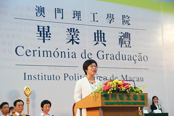 Presided over by Ms Chan Hoi Fan, Acting Chief Executive of Macao S.A.R., Dr. Alexis Tam, Secretary for Social Affairs and Culture and Professor Lei Heong Iok, President of Macao Polytechnic Institute, the Graduation Ceremony for Academic Year 2014-2015 of Macao Polytechnic Institute was held on 16 June 2015 in the MPI Multisport Pavilion with more than six hundred bachelor and higher diploma graduates in attendance. Representatives from the Liaison Office of the Central People's Government in Macao S.A.R., the Foreign Affairs of the People’s Republic of China in Macau SAR, several members of the Legislative Assembly, department heads from different government departments, executives from several entertainment enterprises, secondary school principals, parents and friends also attended the ceremony.