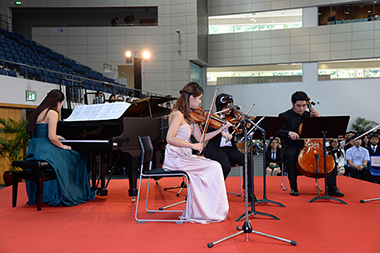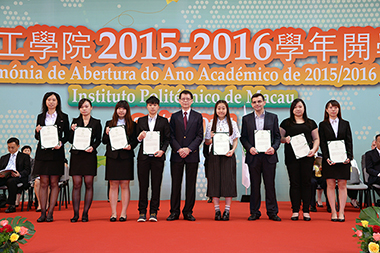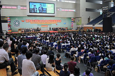 On behalf of all MPI teaching staff, Associate Professor Maggie Wang of the School of Languages and Translation said she expected all students to learn at least three things in the four years of college: how to behave, how to handle matters and how to learn. She hoped students would equip themselves with extensive knowledge, an honest attitude and a noble personality and, at the same time, believed that all MPI teachers would lend students a helping hand on their future voyage. A number of representatives from government departments, organizations, enterprises and individuals, who sponsored MPI’s most excellent students with nearly 300 scholarships, also attended the ceremony. They were from the Macao Foundation, Henry Fok Foundation, Macao Public Administration and Civil Services Bureau, Macao Health Bureau, Macao Cultural Affairs Bureau, Macao Government Tourist Office, Macao Sport Development Board, Macao Social Welfare Bureau, Macao Trade and Investment Promotion Institute, Macao Productivity and Technology Transfer Center, Association for Adult Education of Macao, Companhia de Electricidade de Macau – CEM, S.A., Companhia de Telecomunicações de Macau S.A.R.L. – CTM , China Telecom (Macao) Co., Ltd, Sociedade de Jogos de Macau, S.A, The Venetian Cotai Limited, Wynn Resorts (Macao) S.A., Galaxy Entertainment Group, MGM Macau, Bank of China Macao Branch, Industrial and Commercial Bank of China (Macao), Tai Fung Bank Limited, Seng San Enterprises Ltd., Inspirational Youth Association, Macao Polytechnic Institute Alumni Association, CPA Australia, The Institution of Engineering and Technology, LT Game Limited, Macao Gaming Equipment Manufacturers Association and Macao Polytechnic Institute. Witnessed by all the guests, and both solemn and touching, all the freshmen swore an oath - “MPI’s heart, our new start” - in joining the MPI family. More than a thousand guests, teaching staff, freshmen and parents attended the Opening Ceremony for Academic Year 2015-2016. |