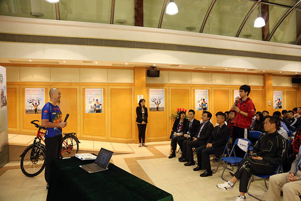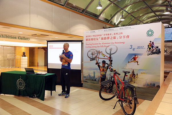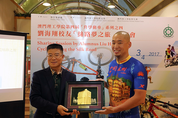 The Student Affairs Office at Macao Polytechnic Institute (“MPI” or the “Institute”) held a “Sharing Session by Alumnus Liu Haixiang: Cycling along the Silk Road” on 3rd April 2017 and MPI Alumnus Mr. Liu Haixiang was invited to share his experience with MPI students. Since 2015, Mr. Liu has started his cycling trip, traveling to more than 10 countries along the Silk Road, wishing to promote the Chinese cultures in those countries and encourage the youth to overcome the difficulties to realize their dreams.