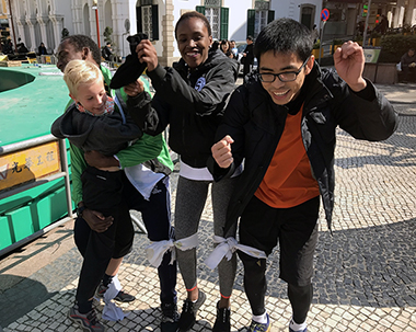 The event was run in English in order to meet the need of the international students. In the competition, students had to go to certain spots in the Central District of Macao to perform the tasks, such as being a salesperson, singing a song in public and also doing exercise, taking photos, hugging, dancing with strangers or even asking them something in the street. Performing the tasks is not just a challenge to the stamina, students have to overcome the psychological barriers with the strangers, breaking their existing perceptional shell and rediscovering themselves beyond the comfort zone. A Portuguese year 1 student Mariana who is studying International Chinese Language Education stated that facing a lot of strangers made her feel embarrassed at the beginning, but with the support and encouragement by the teammates, she gradually got used to the environment and finished the missions well. A year 3 student Leong who is studying E-Commerce discussed that since he is more familiar with Macao city, he was able to guide the other two international students within the team and those two international students interacted with the citizens well and with passion. By accomplishing the missions together, students have overcome the communication gap, gained true and precious friendship and understood the value of team spirit.
