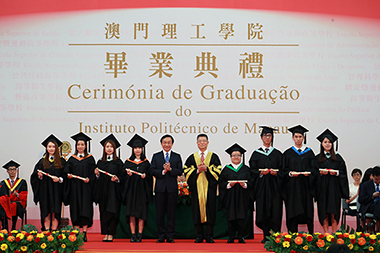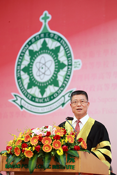 President Prof. Lei Heong Iok said in his speech that MPI became one favourable higher education institution among the local and overseas students, and had produced since 1999 about 18,000 graduates jointly or independently recruited by its 37 degree programmes including 22 bachelor degree programmes, 12 master degree programmes and 2 doctoral degree programmes. The success of MPI attribute to the guidance from the Macao SAR Government, concern from all sectors of society, and endeavour and cooperation from MPI staff and students. The achievements of MPI, one public higher education institution, mirror authentically the continual development and progress of higher education in Macao, as well as those of society, culture and economy in Macao, since its return to the Motherland. President Lei wished all the graduates a bright and promising future and anticipated more concern and support for talent-training from the society.