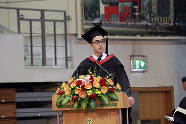 Student representative of MPI graduates delivering his speech of thanks at the graduation ceremony |