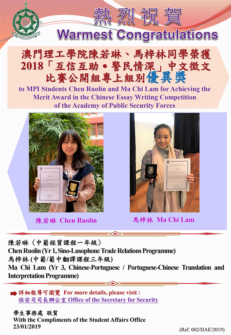 MPI Students Chen Ruolin and Ma Chi Lam Achieve the Merit Award in the Chinese Essay Writing Competition of the Academy of Public Security Forces