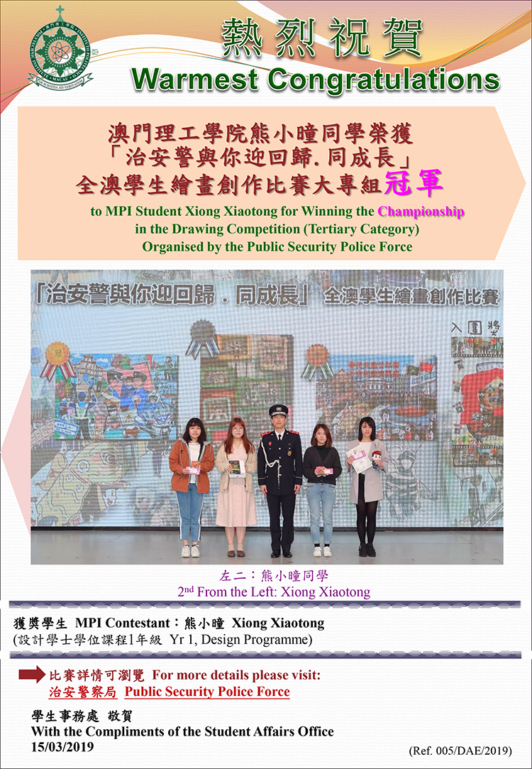 MPI Student Xiong Xiaotong for Winning the Championship in the Drawing Competition (Tertiary Category) Organised by the Public Security Police Force