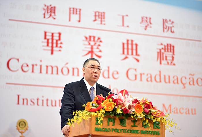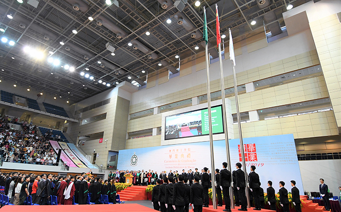 The ceremony was initiated with a flag-raising ceremony accompanied by the national anthem, the first of this solemn agenda in consecutive two years at graduation ceremonies in Macao higher education institutions. The ceremony was officiated by the Chief Executive of Macao Dr. Fernando Chui Sai On, the Secretary for Social Affairs and Culture Dr. Alexis Tam Chon Weng and the President of MPI Prof. Marcus Im Sio Kei. Distinguished guests attending the ceremony included, among others, Mr. Xue Xiaofeng, the Deputy-Director of the Liaison Office of the Central People's Government in the Macao SAR, Counsellor Ran Bo, Director of the Department of Policy Research of the Office of the Commissioner of the Ministry of Foreign Affairs in the Macao SAR, Mr. Zhao Jianming, Chief of Staff of The People's Liberation Army Macao Garrison, members of the Macao Polytechnic Institute Consultancy Committee, representatives from government departments and representatives of scholarship-donating organizations. Over 3000 graduates with their families and friends also attended and witnessed the ceremony.