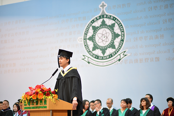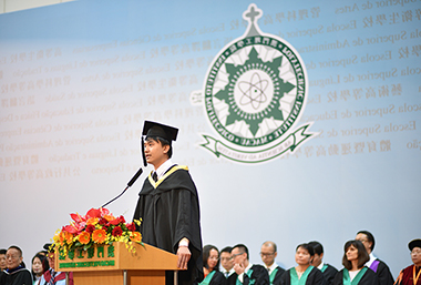 The graduate representative, Wong Chong Chon of the Public Administration Programme, expressed thanks for the support and encouragement from families and friends, the education and training from teachers, and the high care and concern from the Macao SAR government towards all students in higher education institutions. He shared his MPI experiences of studying with classmates from different places, different nationalities and different cultural backgrounds. He also shared his success in graduation with his families and teachers. In the last part of his speech, he encouraged the graduates to take up the social responsibility and mission, keep learning all life long, remain true to the faith, bravely follow the truths and dreams to contribute to the society and to win honour for the alma mater.