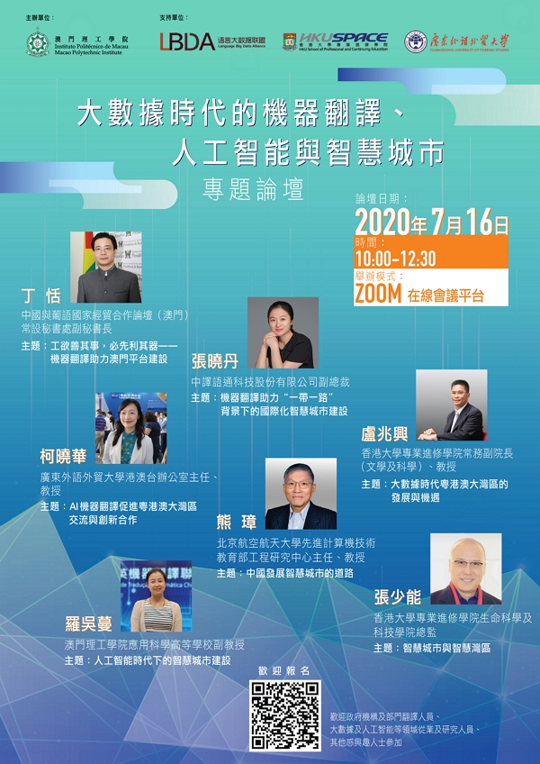 In order to better explore cutting-edge technology, discuss the latest scientific research achievements in the field of machine translation, artificial intelligence and smart cities, train and bring together innovative talents, serve the Guangdong-Hong Kong-Macao Greater Bay Area and the overall situation of national construction and development, and continuously assist and enhance China and the “Belt and Road” countries with science and technology innovation cooperation, the Macao Polytechnic Institute and three support units, the Language Big Data Alliance, Guangdong University of Foreign Studies and Hong Kong University School of Professional and Continuing Education, will hold the thematic forum on “Machine Translation, Artificial Intelligence and Smart Cities in the Big Data Era” in the morning of 16th July 2020. The forum will be conducted online through the ZOOM online platform. Translators from government agencies and departments, practitioners and researchers from the fields of big data and artificial intelligence, as well as other interested parties, are all welcome to participate.