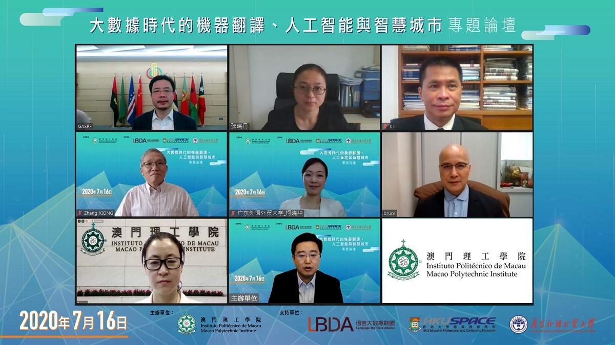 Hosted by Macao Polytechnic Institute (MPI) and supported by the Language Big Data Alliance (LBDA), Guangdong University of Foreign Studies (GDUFS) and Hong Kong University School of Professional and Continuing Education (HKUSPACE), the Forum gathered keynote speakers from Beijing, Guangdong, Hong Kong, and Macao representing the government, academia, and business sectors on the cloud platform to express their opinions, discuss the use of innovative technology to stimulate the construction of the “Platform between China and Portuguese-Speaking Countries” (hereinafter the “Platform”) and the creation of the “Smart Bay Area”. The forum attracted more than 100 interested parties from the United Kingdom, Portugal, Australia, South Korea, Hong Kong, Macao, the Mainland and many more; translators of governmental units and departments in Macao, as well as academics, researchers and practitioners from higher education, banks and the business sector participated in this forum.