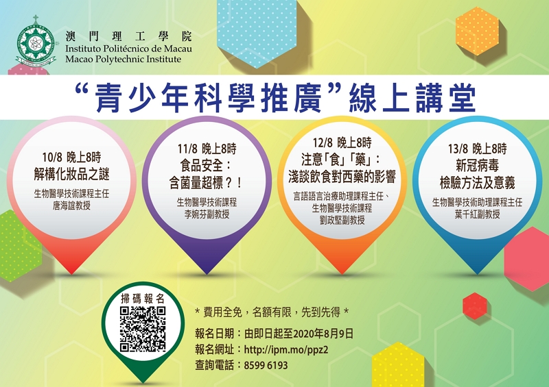 The online lectures on “Scientific Promotion for Youth” will be held at 8 pm every night from August 10 to 13. The registration period is from now to August 9. Youth and interested parties are welcome to register at http://ipm.mo/ppz2 on a first come, first served basis. For enquiries, please contact Ms. Iun at 8599 6193.