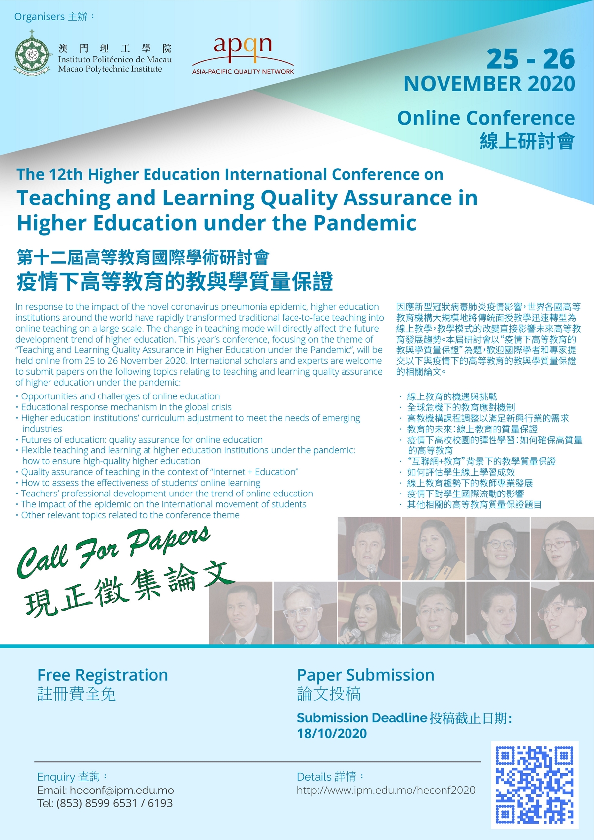 To strengthen the cooperation between Macao and higher education institutions from overseas, and continue to improve the quality of teaching and learning in higher education, the Macao Polytechnic Institute (MPI) and the Asia Pacific Quality Network (APQN) are jointly organising “The 12th Higher Education International Conference on Teaching and Learning Quality Assurance in Higher Education under the Pandemic”. The conference focuses on the challenges and future development of higher education under the pandemic and offers an exchange platform for Macao and higher education assurance agencies and well-known scholars from around the world. The conference calls for papers from now to October 18. Higher education experts and scholars from Macao and all over the world are welcome to take part in and publish papers in fields related to the conference theme.