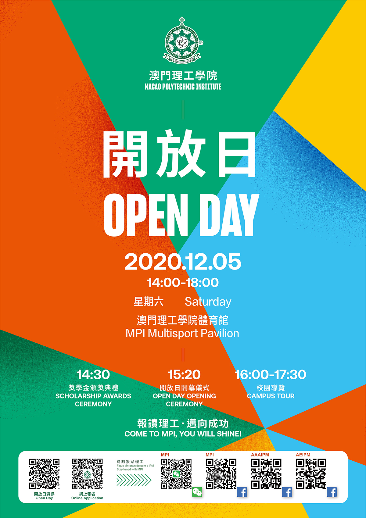 In addition to a rich variety of exciting activities prepared for the Open Day, MPI has also arranged on-site applications in the Sports Pavilion. The enrollment period for the Bachelor’s degree programmes starts right now and will remain open until January 20, 2021; while the Master’s and Doctoral degree programmes will continue to accept applications until February 26, 2021. For further inquiries please call us at 85996111, or browse our MPI website at www.ipm.edu.mo; you are also welcome to visit our Facebook page or WeChat account at ipmadmission.