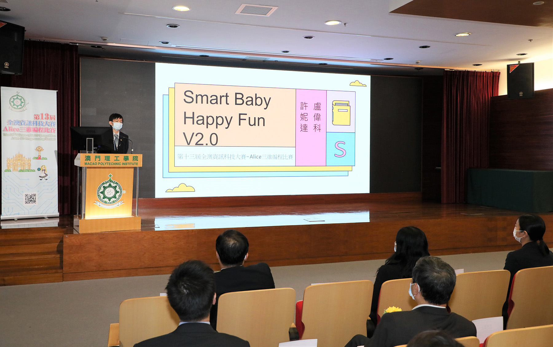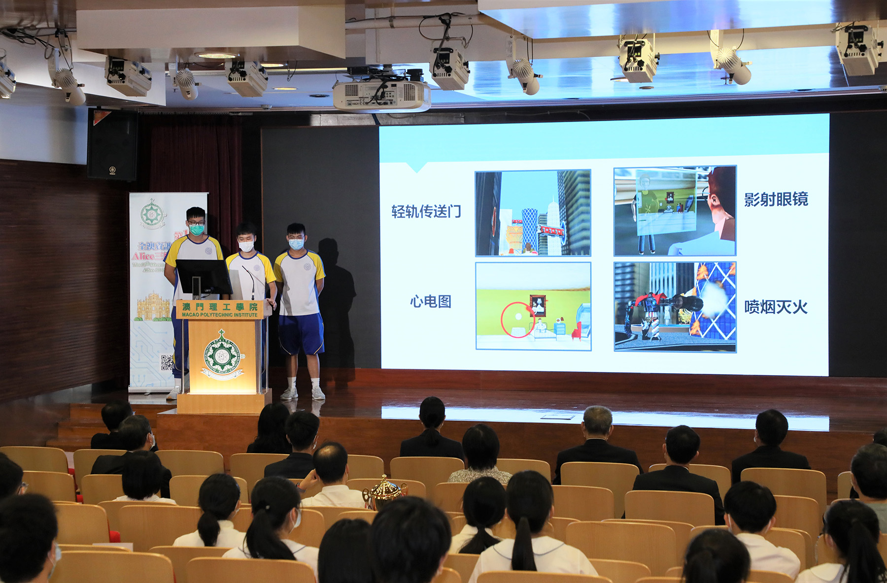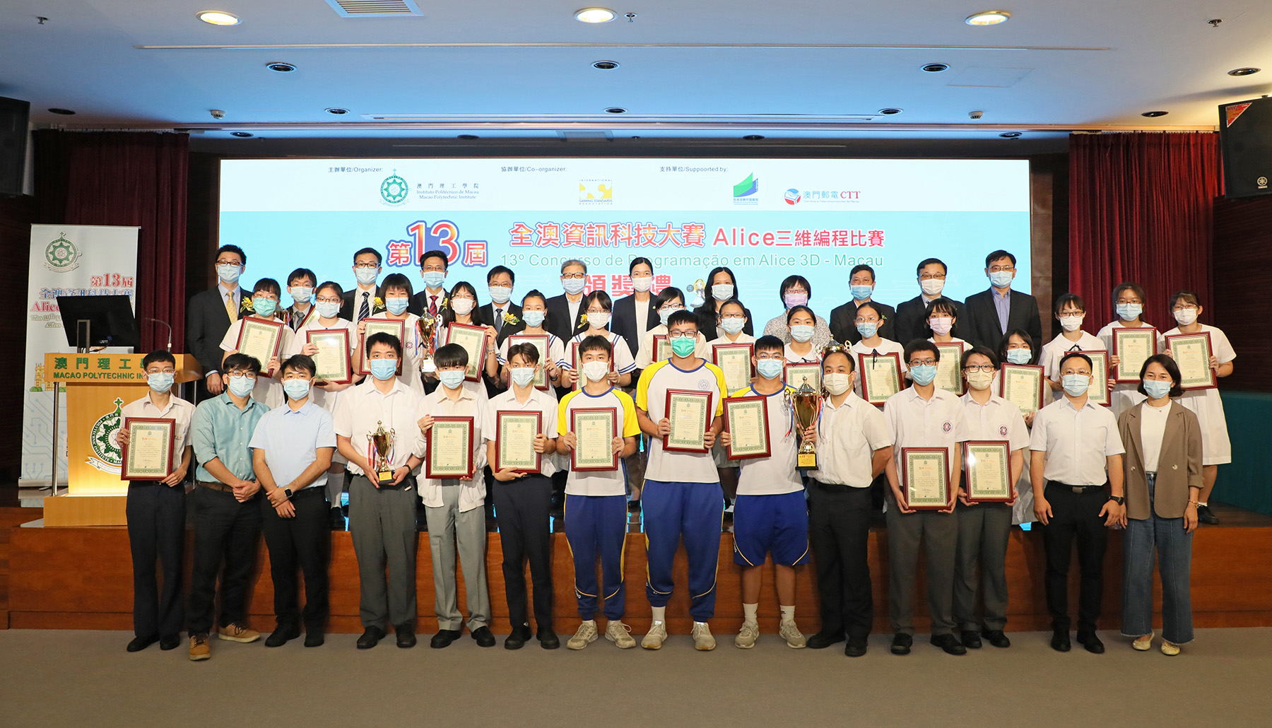 The Award Ceremony of the "13th Macao-wide IT Competition – Alice 3D Programming Contest", hosted by the Macao Polytechnic Institute (MPI), co-organized by the International Gaming Standards Association (iGSA), supported by the Education and Youth Development Bureau of the Government of the Macao Special Administrative Region and the Macao Post and Telecommunications Bureau, was held at MPI on the afternoon of 22 July, 2021. It was officiated by Lei Ngan Lin, Vice-President of Macao Polytechnic Institute, Wan Kam Meng, Honorary Fellow of the Guangdong Institution of Engineers and President of the Macao Computer Society, Lai Iok In, the Head of the Information and Technology Division of the Education and Youth Development Bureau, Lei Kuong Leong, the Head of Information Technology Development Division of the Macao Post and Telecommunications Bureau, Chan Keng Lim, Vice Principal of Pui Ching Middle School, Li Iok Meng, Vice Principal of Santa Rosa de Lima English Secondary School, Tam Seak Tim and Kong Iam Iok, Vice Principals of Escola Choi Nong Chi Tai. Participation in this competition was enthusiastic, with a total of nearly 80 teams and over 300 people registering for the competition. The First Prize winners of the secondary school category are Qian Jiahong, Ho Kwan Yuen, Tou Wai Chon and their mentor Fong Wai Sao from Escola Choi Nong Chi Tai. Their work is "Frozen Human Meets Forward-Looking Technology". The First Prize of the open category was won by Lou Wai Fo and Hoi Nei Tat for their work "Smart Baby Happy Fun V2.0".