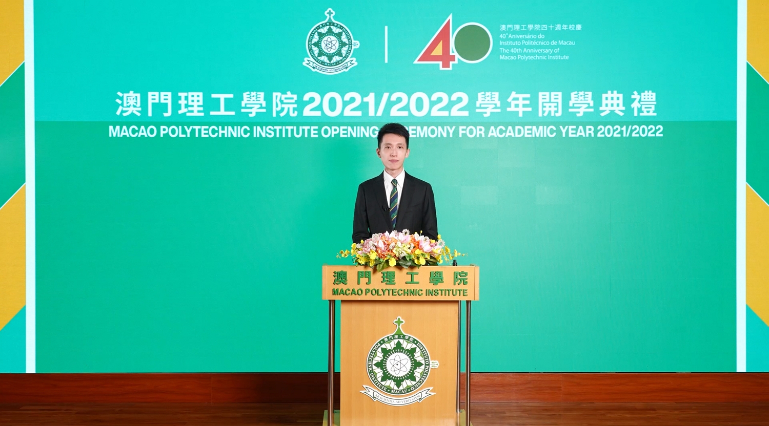 The Macao Polytechnic Institute held the opening ceremony for the academic year 2021/2022 at 3 pm on August 17 and welcomed more than 1,300 local and overseas new students from Macao, the Greater Bay Area, Portuguese-speaking countries enrolled in undergraduate, master’s, and doctoral degree programs. As a responsive measure following guidelines of the pandemic, the opening ceremony was held online. MPI president Professor Im Sio Kei delivered the very first lesson to all freshmen students, calling upon them to uphold the core values of patriotism and love for Macao. Students were encouraged to practice patriotism and shoulder responsibilities and commitments; to work hard at their studies to broaden their horizons and to equip themselves with adequate knowledge to make contributions to the development of the country and Macao. MPI faculty staff and students gathered online to witness new students taking the oath "MPI’s heart, our new start" to join the big MPI family, which formally kicked off their new journey in life.