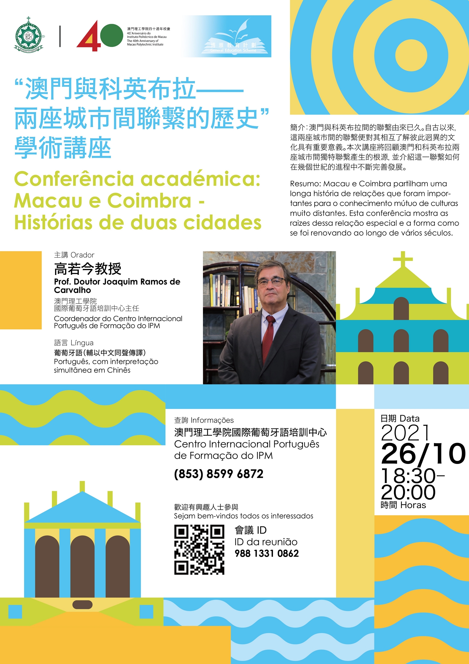 You are cordially invited to attend the “Online Seminar on Historical Connection between Macao and Coimbra”, to be presented by Professor Joaquim Ramos de Carvalho, Director of the International Portuguese Training Centre for Conference Interpreting of the Macao Polytechnic Institute, on 26th October 2021, to explore the historical connection that binds the two cities in terms of economy, culture and academic exchange, and to analyse the long-term bilateral relationship and development. The seminar is one of the educational activities under the MPI’s General Education Scheme, which aims to strengthen Macao’s talent development, promote multi-disciplinary learning by the students and enhance their knowledge and skills in a comprehensive manner.