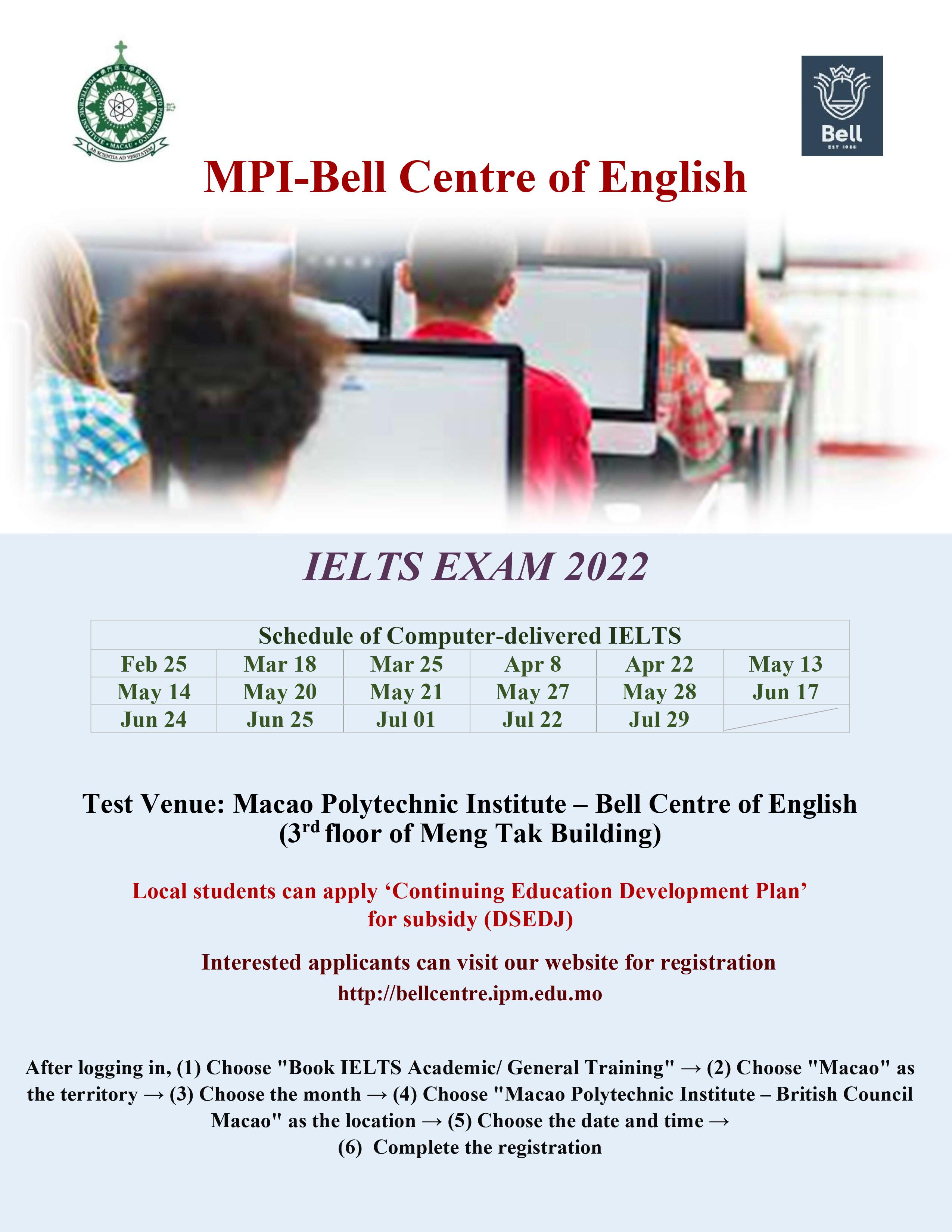 The Bell Centre of English of Macao Polytechnic Institute (MPI-Bell) was the first to offer the IELTS test in Macao. It locates in the centre of Macao and is easily accessible by public transport. IELTS test days at MPI-Bell are: February 25th, March 18th and 25th, April 8th and 22nd , May 13th, 14th, 20th, 21st, 27th and 28th, June 17th, 24th and 25th, July 01, 22 and 29.