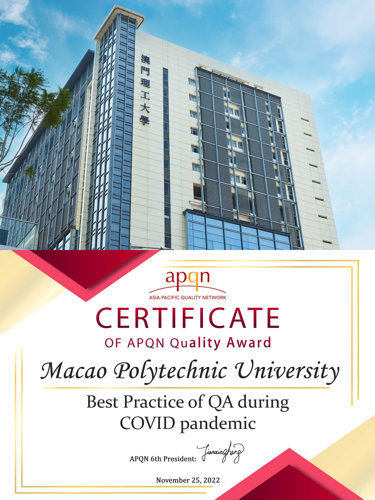 Macao Polytechnic University has been conferred the “APQN Quality Awards – Best Practice of QA during COVID Pandemic” at the 2022 session of Asia-Pacific Quality Network (APQN) held in Singapore. It is the only tertiary education institution in Macao to win the “APQN Quality Awards”.