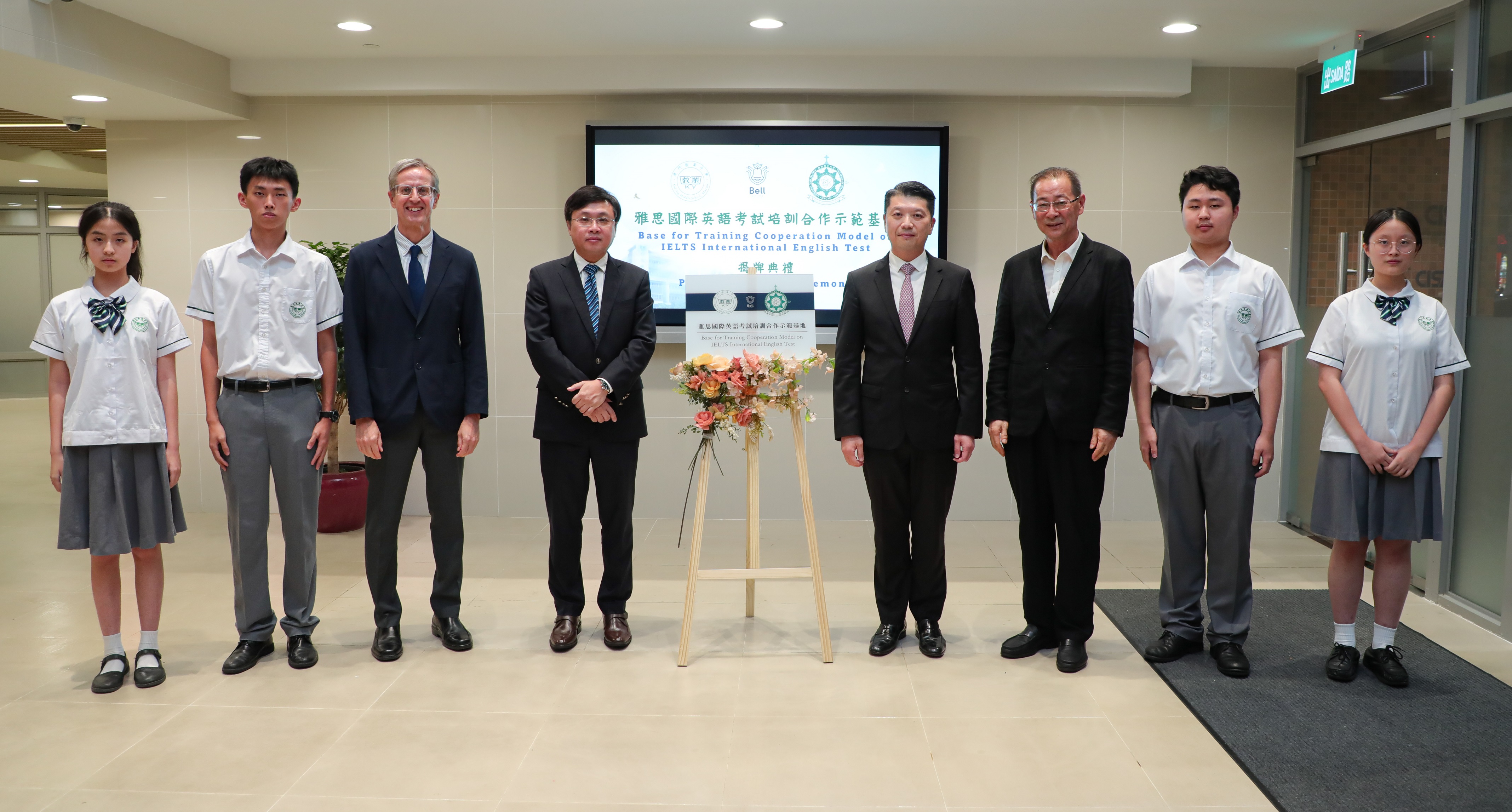 In order to facilitate the policy initiatives of the Macao SAR government and establish Macao as a prominent hub for international examination and certification services, contributing to the development of Macao as the “World Centre of Tourism and Leisure”, Macao Polytechnic University (MPU) and Kao Yip Middle School have jointly established the pioneering “Base for Training Cooperation Model on IELTS International English Test” in Macao, the plaque unveiling ceremony for which took place on October 19, 2023. The base aims to nurture English talents in a comprehensive way, further promoting the development of students’ English learning and examination skills and enhance the overall standard of English proficiency in Macao.