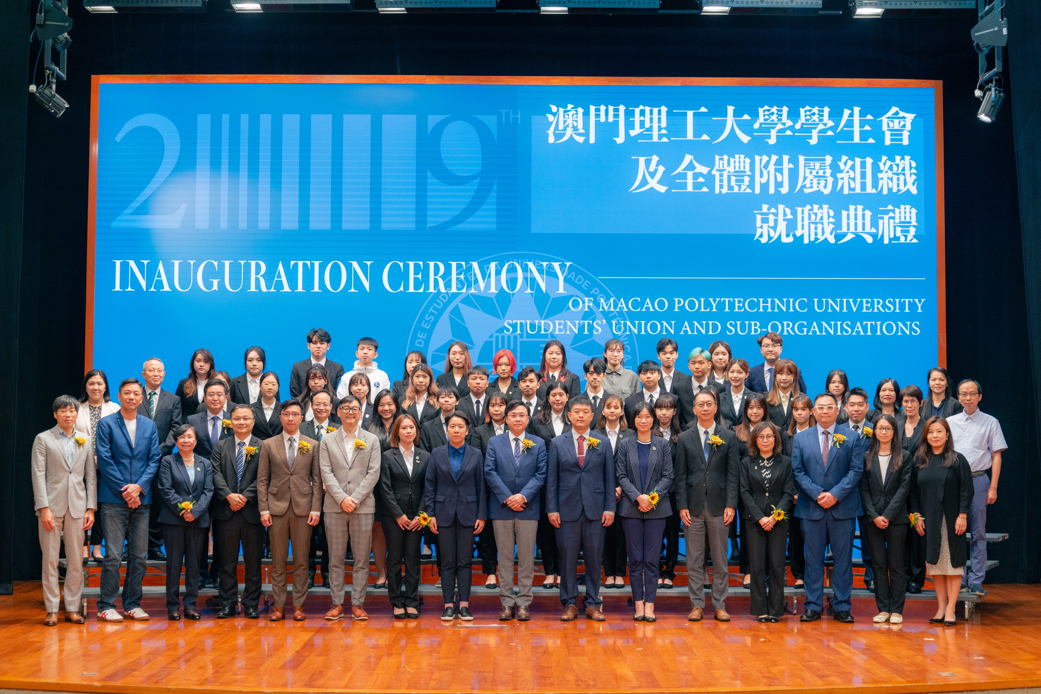 The ceremony was attended by Professor Im Sio Kei, Rector of Macao Polytechnic University; Li Yongle, representative from the Education and Youth Affairs Department of the Liaison Office of the Central People’s Government in the Macao SAR; Lei Im Kei, Acting Head of the Student Services Department of the Education and Youth Development Bureau of the Macao SAR Government; Leong Ka Fai, Director of the Professional Development and Planning Department of the Social Work Bureau; and senior personnel of over twenty organisations and other distinguished guests. They witnessed the inauguration of the new term of the Students’ Union and its sub-organisations at Macao Polytechnic University in a festive atmosphere.