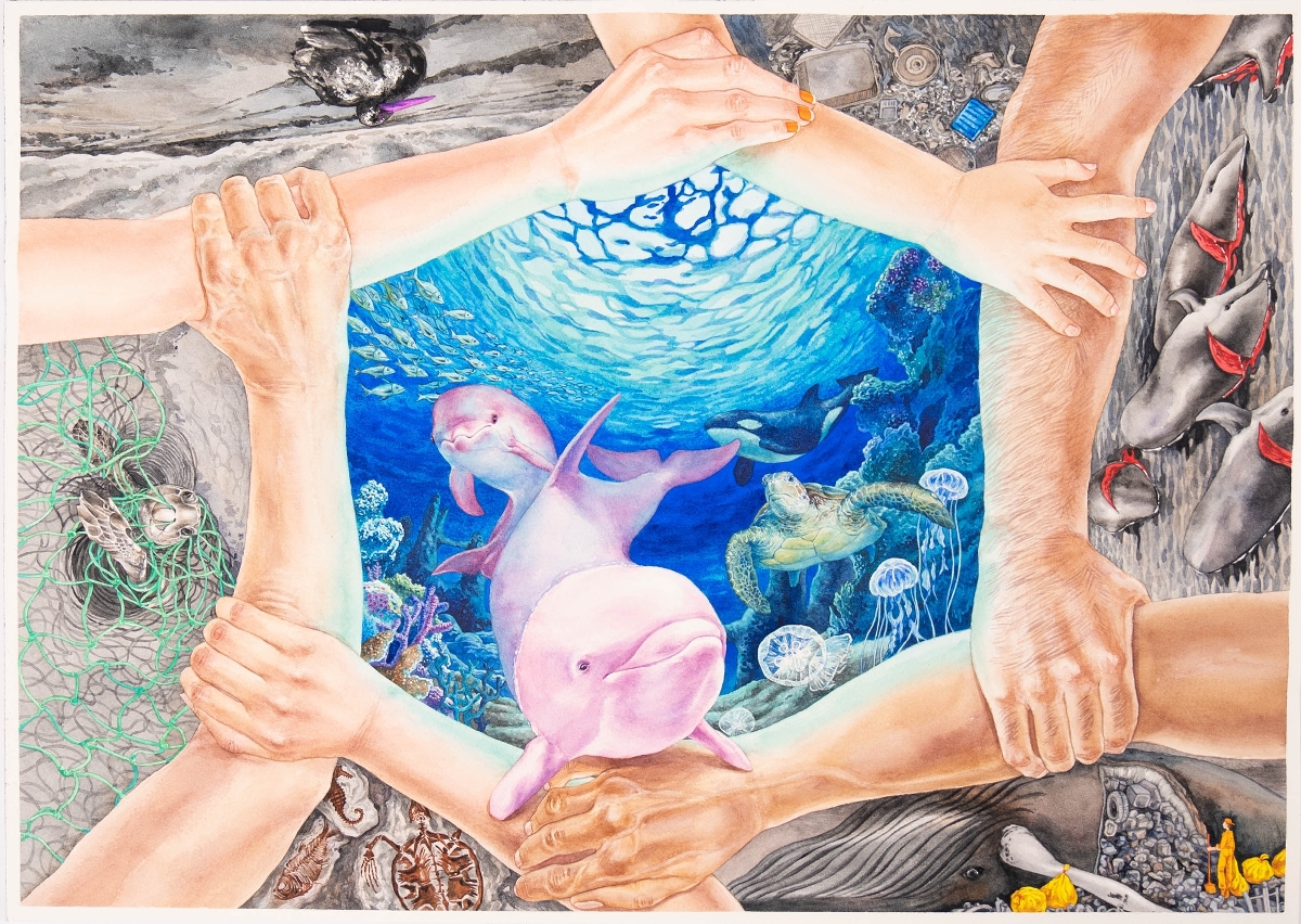 To encourage students, youngsters and members of the public to express their impressions of marine life through art, and with a view to promoting public awareness on conservation of marine resources, The Municipal Affairs Bureau of Macao SAR, the Marine and Water Bureau, the Department of Natural Resources of Guangdong Province, the Hong Kong Agriculture, Fisheries and Conservation Department, and the Ocean Park Conservation Foundation Hong Kong jointly organised the "Painting the Colorful Ocean, Protecting Our Home – Guangdong-Hong Kong-Macao Marine Life Drawing Competition 2022”. The competition attracted participation from young students and people from the three regions, with over 6,000 pieces of work submitted. Macao Polytechnic University Student Kwan Hoi Io, a student from the Bachelor of Arts in Design, won the Open Group Grand Champion of Guangdong-Hong Kong-Macao.