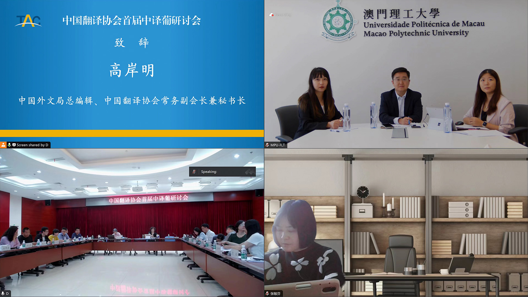 The Faculty of Languages and Translation (FLT) of the Macao Polytechnic University (MPU) was invited to participate online in the First Chinese-Portuguese Translation Seminar organised by the Translators Association of China (TAC). The seminar was co-hosted by the Foreign Languages Press, the Academy of Contemporary China and World Studies, and the Academy of Translation and Interpretation of China International Communications Group. More than 20 senior translation experts and frontline professionals from the Ministry of Foreign Affairs, Xinhua News Agency, China Media Group, China International Communications Group, Peking University, Beijing Foreign Studies University, Communication University of China, Shanghai International Studies University, Beijing International Studies University, and MPU attended the seminar. The participants engaged in in-depth discussions on the standardisation and normalisation of Chinese-to-Portuguese translation of political discourses, as well as the key contents of the “Standards and Norms for Translating Chinese Political Discourse into Portuguese”, resulting in a broad consensus and fruitful outcomes. As the only university invited from Macau, MPU greatly benefited from this seminar.