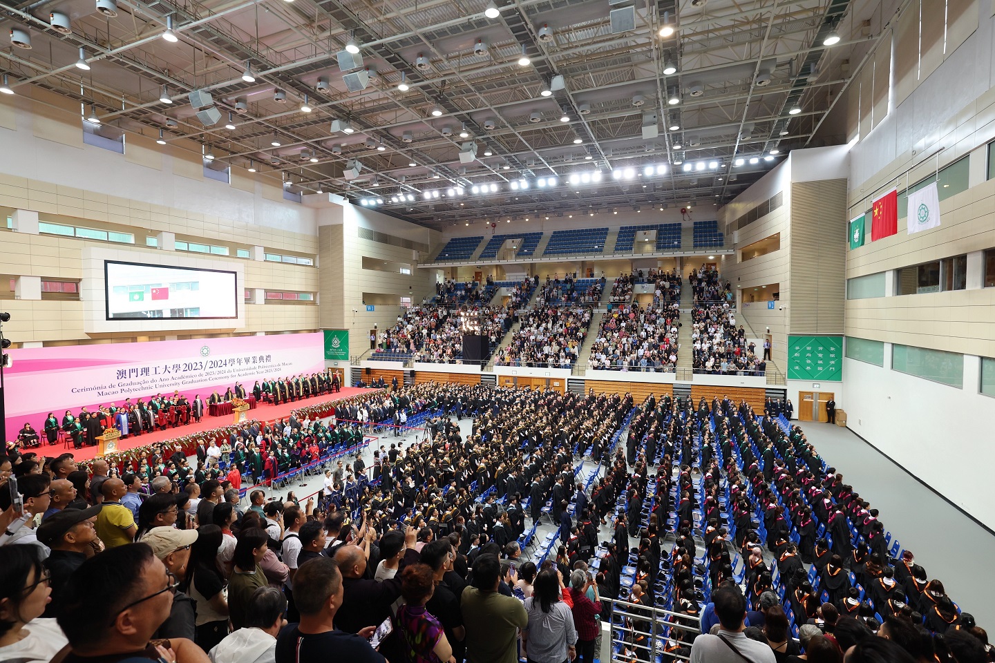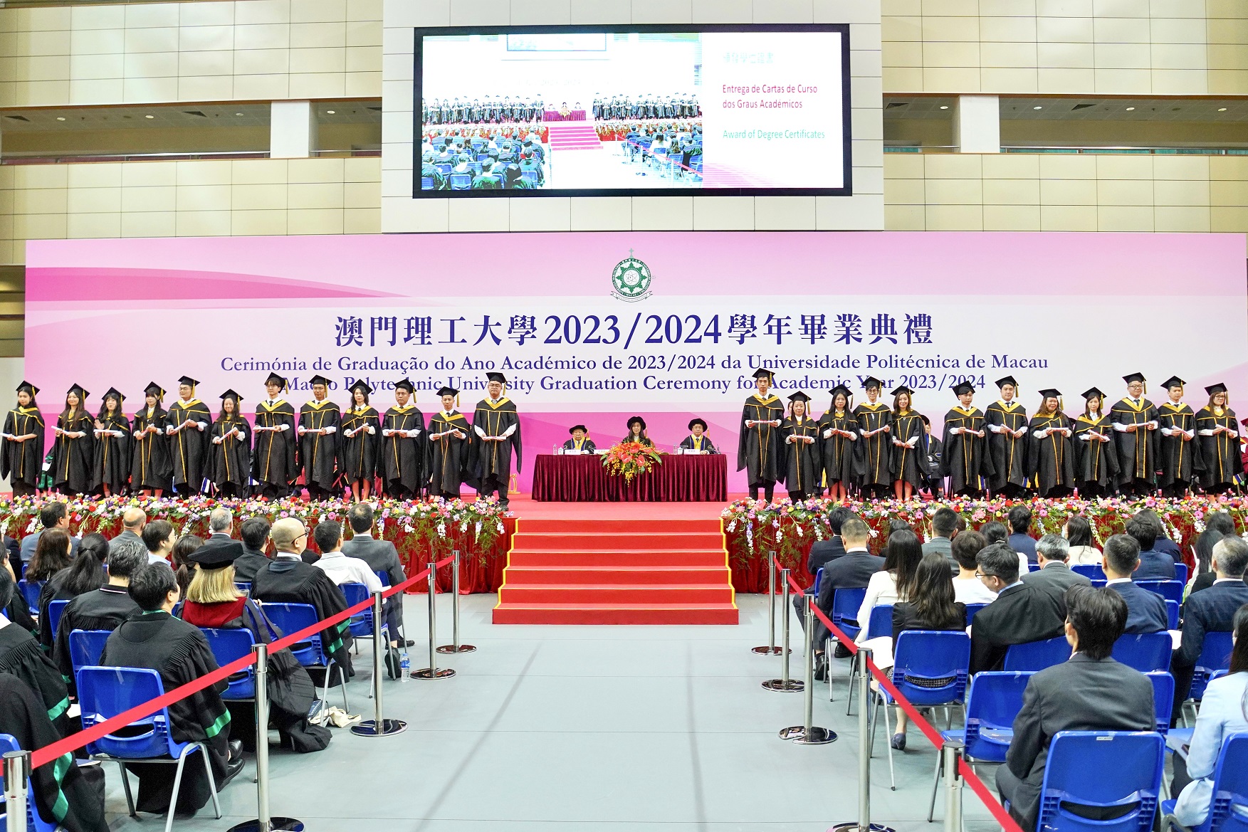 Macao Polytechnic University (MPU) held the graduation ceremony of the academic year 2023/2024 today, June 7th, at 4 PM in the Multi-Sport Pavilion. The ceremony featured the raising of the national flag and the singing of the national anthem. A total of one thousand students graduated, including those receiving doctoral, master's, and bachelor's degrees. During the ceremony, honorary doctorate degrees were also awarded to individuals who have made significant contributions to society and educational development. The Secretary for Social Affairs and Culture, Ao Ieong U, who represented the Chief Executive of the Macao SAR and Chancellor of MPU, stated that MPU has more effectively utilized the academic and research strengths of Macao's higher education institutions in major initiatives such as promoting the moderate diversification of Macao's economy, constructing the Greater Bay Area's technology and innovation corridor, and developing the Portuguese Language Education Alliance in the Greater Bay Area.
