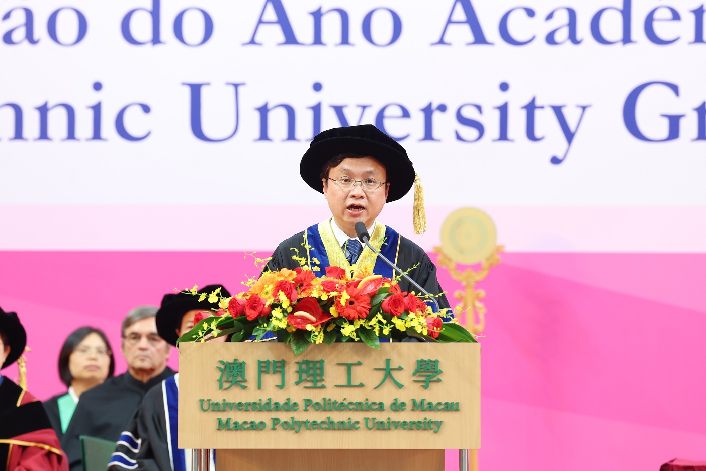 In his speech, Rector Im Sio Kei expressed gratitude for the support from the country, the Macao SAR government, and all sectors of society. He also stated that, to align with Macao's development as "One Center, One Platform, One Base", MPU has launched a series of degree programs to assist in Macao's "1+4" economic diversification plan, which has been well received by both society and students. MPU has repeatedly been honored with national and international accolades, received the Medal of Merit in Education from the Macao SAR government, and seen its students achieve outstanding results in various international research and competitions. These achievements have fully demonstrated MPU's excellent research capabilities and innovative educational models, earning recognition both nationally and internationally. Rector Im Sio Kei encouraged the graduates to uphold the fine tradition of patriotism and love for Macao, set ambitious goals, strive for success, and persist in hard work and innovation. MPU will continue to excel in talent cultivation, scientific research, and social services, contributing to the steady and long-term success of the "One Country, Two Systems" policy in Macao in the new era and new journey.