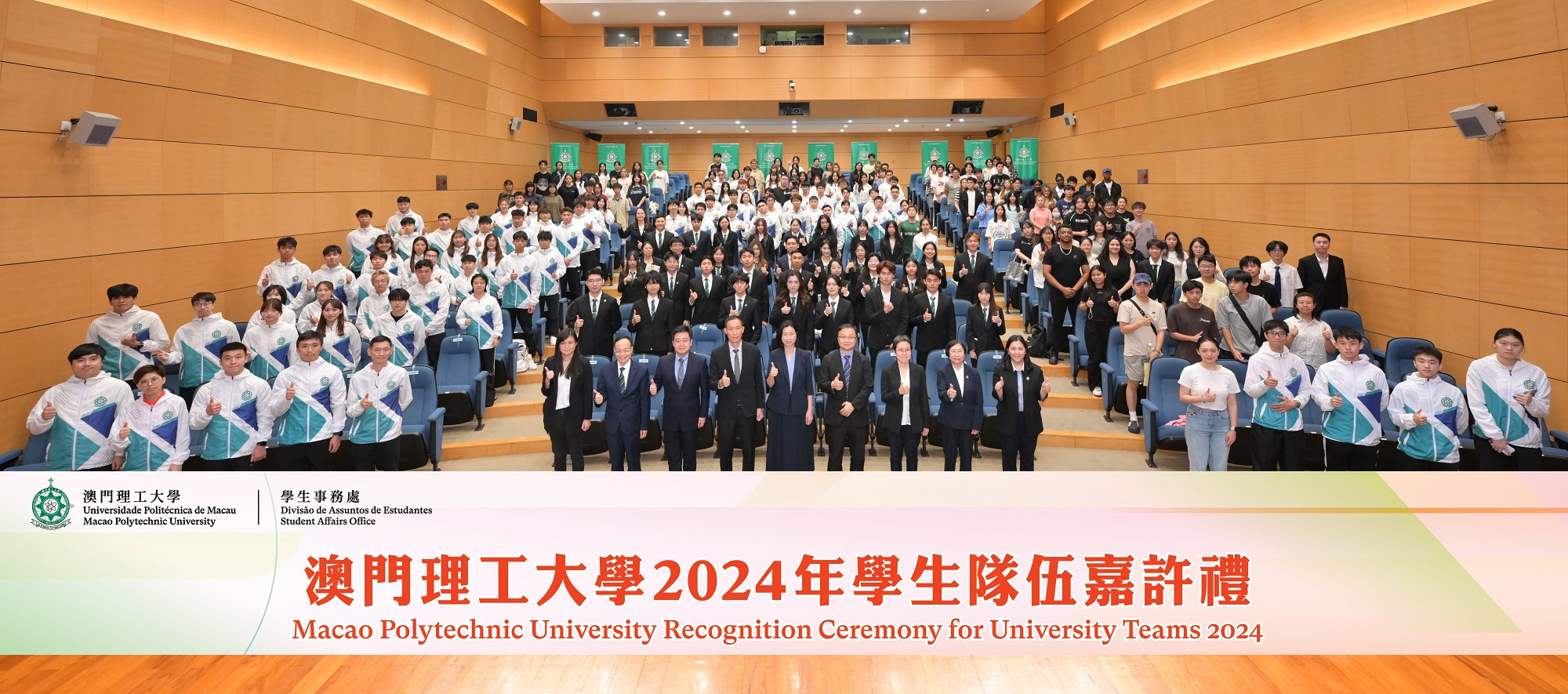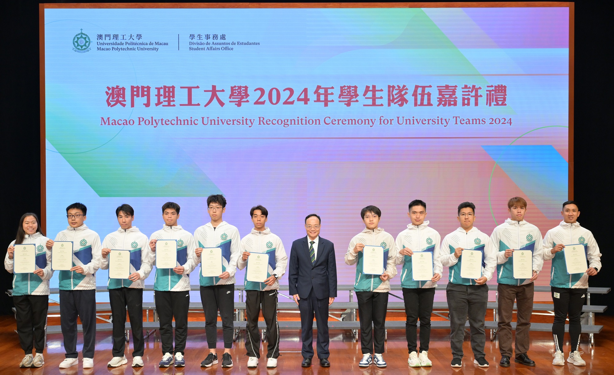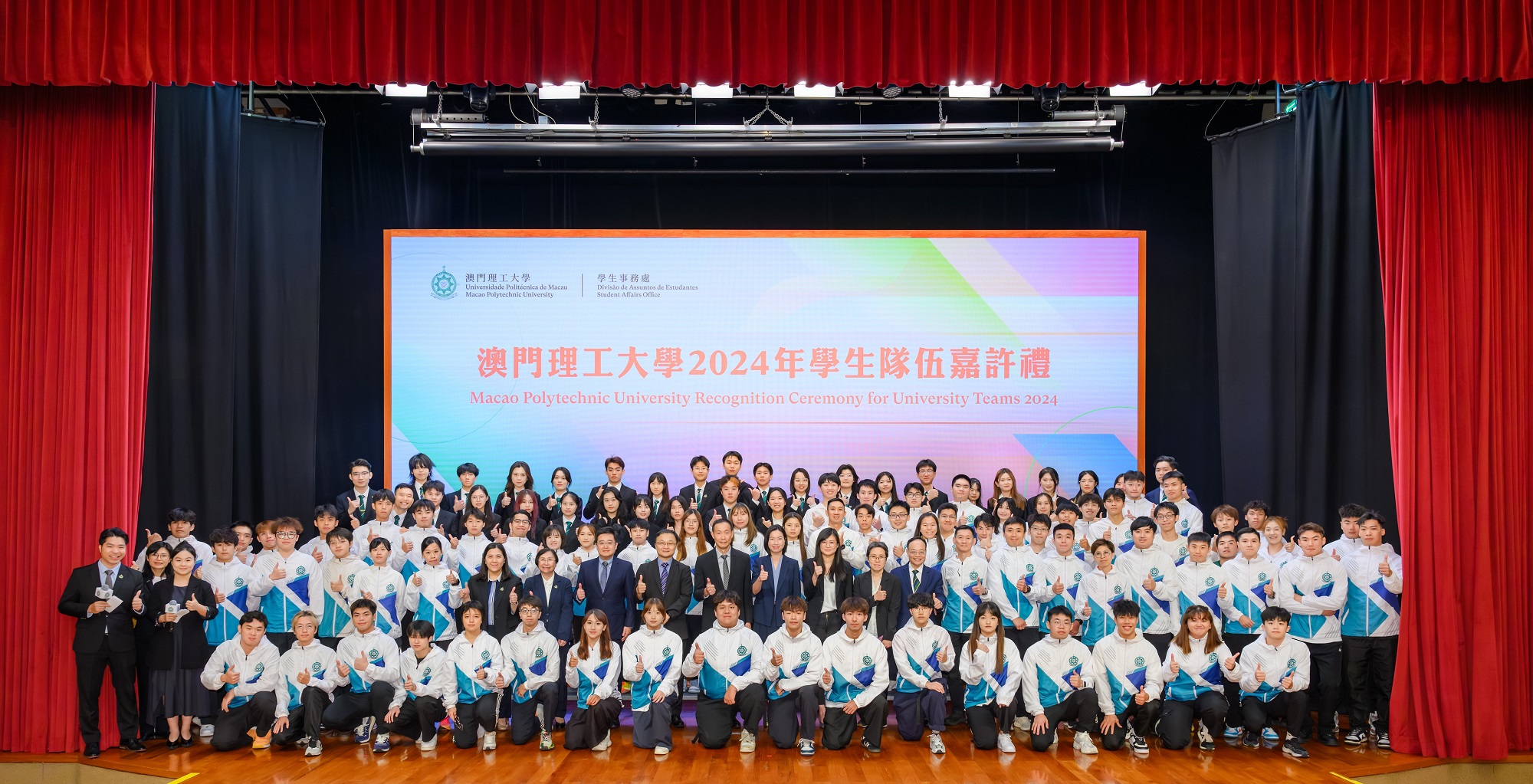 In recognition of outstanding team members from the University Teams at MPU and to encourage students’ active participation in various competitions and activities, MPU held the “Macao Polytechnic University Recognition Ceremony for University Teams 2024”. Vice-Rector of MPU, Dr. Lei Ngan Lin, and Deans from various faculties attended the event and presented recognition certificates to the University Teams, recognising their outstanding performance and encouraging them to continue demonstrating their spirit of perseverance and strive for even greater achievements. As MPU continues to cultivate well-rounded professional talents, it also strives to enhance students’ patriotism and comprehensive qualities, cultivating more outstanding talents for the country and Macao. Over 300 people attended the recognition ceremony, creating a joyful and heartwarming atmosphere.