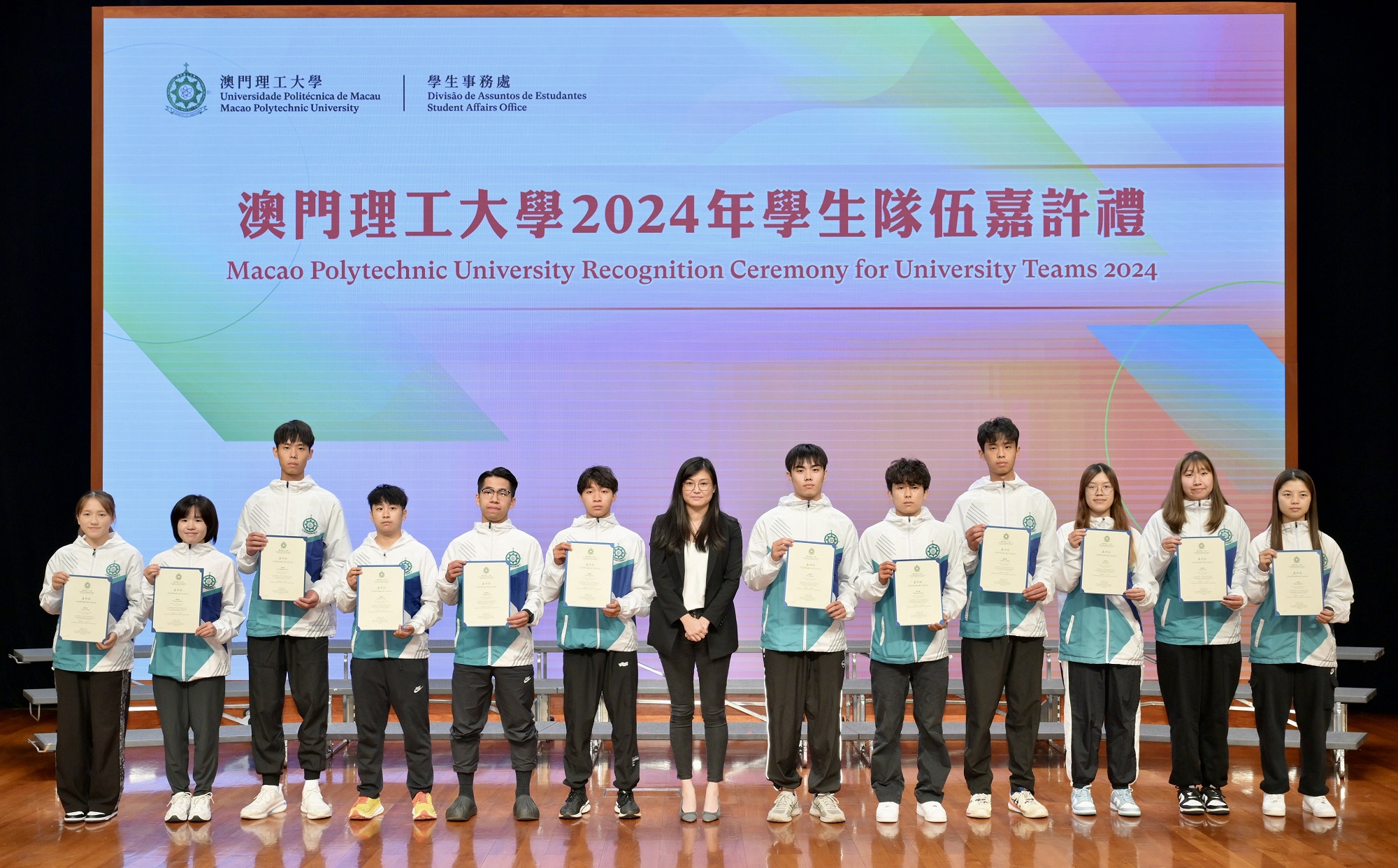Recognition certificates were presented to outstanding members of the national flag team, sports teams, and cultural and artistic teams. The MPU University Teams receive professional training, participate in local, national and international competitions every year, and continue to make remarkable achievements. Distinguished guests attending the recognition ceremony included Dean of the Faculty of Applied Sciences, Dr. Lam Chan Tong; Dean of the Faculty of Health Sciences and Sports, Dr. Ng San Fan, and Associate Dean Dr. Lam Nogueira Oi Ching; Dean of the Faculty of Languages and Translation, Dr. Zhang Yunfeng; Acting Dean of the Faculty of Arts and Design, Dr. Lai Mei Kei; Dean of the Faculty of Business, Dr. Huang Guihai; Head of Academic Affairs Department, Ms. Cheong Weng Lam; and Head of the Student Affairs Office, Ms. Lao Weng Ian.