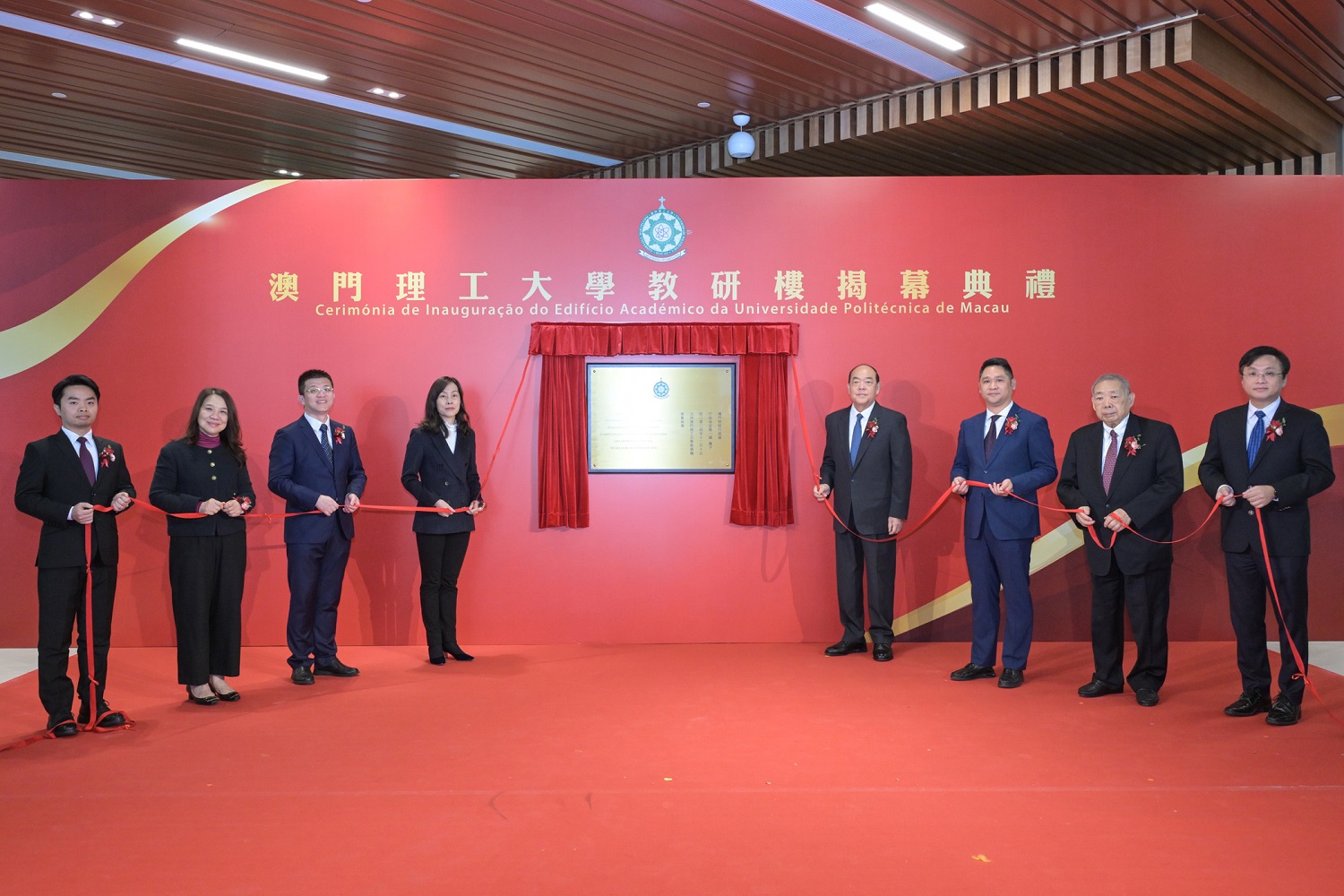 To commemorate the 75th anniversary of the founding of the People's Republic of China and the 25th anniversary of the establishment of the Macao Special Administrative Region, the inauguration ceremony of the Macao Polytechnic University Academic Building was held today (10th) at 10:30 AM in the Academic Building. The ceremony was presided over by Ho Iat Seng, the Chief Executive of the Macao Special Administrative Region; Ao Ieong U, Secretary for Social Affairs and Culture; Shi Shuzheng, Deputy Director of the Education and Youth Affairs Department of the Liaison Office of the Central People's Government in the Macao SAR; Gao Yuan, Counsellor and Director of the News and Public Diplomacy Department of the Office of the Commissioner of the Ministry of Foreign Affairs of the People's Republic of China in the Macao SAR; Chui Sai Cheong, President of the University Council; Ho Ioc San, Chief-of-cabinet of the Office of the Secretary for Social Affairs and Culture; Marcus Im, Rector of the University, and Teng Sio Hong, Deputy Director of the Education and Youth Development Bureau.