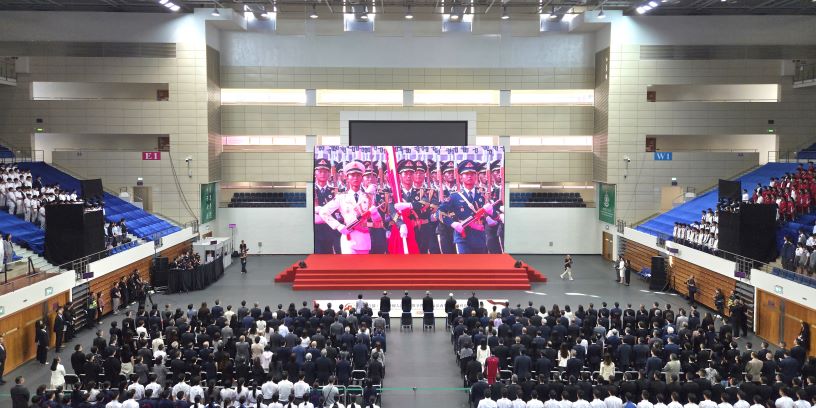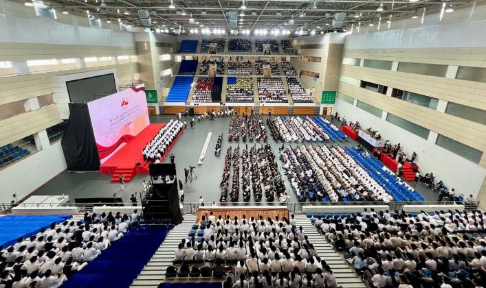 In the morning, live-streaming sessions of the “Grand Commemorative Assembly Marking the 80th Anniversary of the Victory in the Chinese People's War of Resistance Against Japanese Aggression and the World Anti-Fascist War” were held across the city. Vice Rector Vivian Lei, along with deans and heads from various academic and administrative departments, led over 300 faculty members and students in participating in the sessions at multiple venues, including the sports pavilions at MPU and UM, and Macao Science Center. Many more students joined the live-streaming sessions all over the campus.