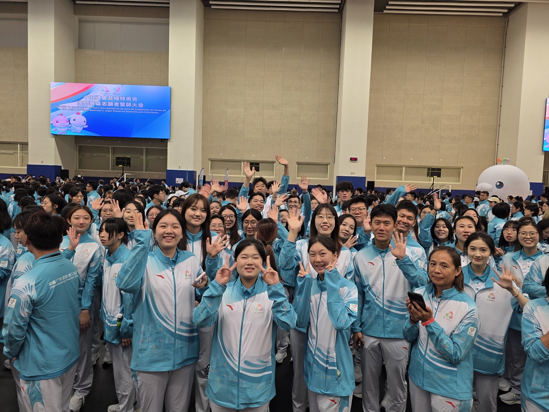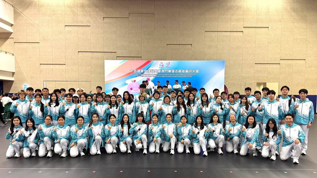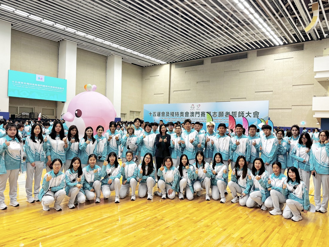 To support the Macao Sports Delegation in achieving outstanding results and promoting the spirit of volunteerism among the general public, the Organising Committee of the Macao Competition Zone of the 15th National Games, the 12th National Games for Persons with Disabilities, and the 9th National Special Olympic Games held the “Ceremonies for the handover of the Macao SAR flag to the Macao sports delegation and the Volunteer Oath-Taking Ceremony for the Macao Competition Zone of the 15th National Games, the 12th National Games for Persons with Disabilities, and the 9th National Special Olympic Games.” The event was presided over by Chief Executive Sam Hou Fai, along with Secretary for Social Affairs and Culture O Lam; the Chief-of-Office of the Chief Executive’s Office Chan Kak; Head of the Preparatory Office for the Organisation of Macao Competition Zone of the 15th National Games, the 12th National Games for Persons with Disabilities, and the 9th National Special Olympic Games Pun Weng Kun; and other distinguished guests. Faculty and student volunteers from Macao Polytechnic University (MPU) actively responded, showcasing the student volunteers’ enthusiastic spirit and creating a vibrant atmosphere for the sporting event.