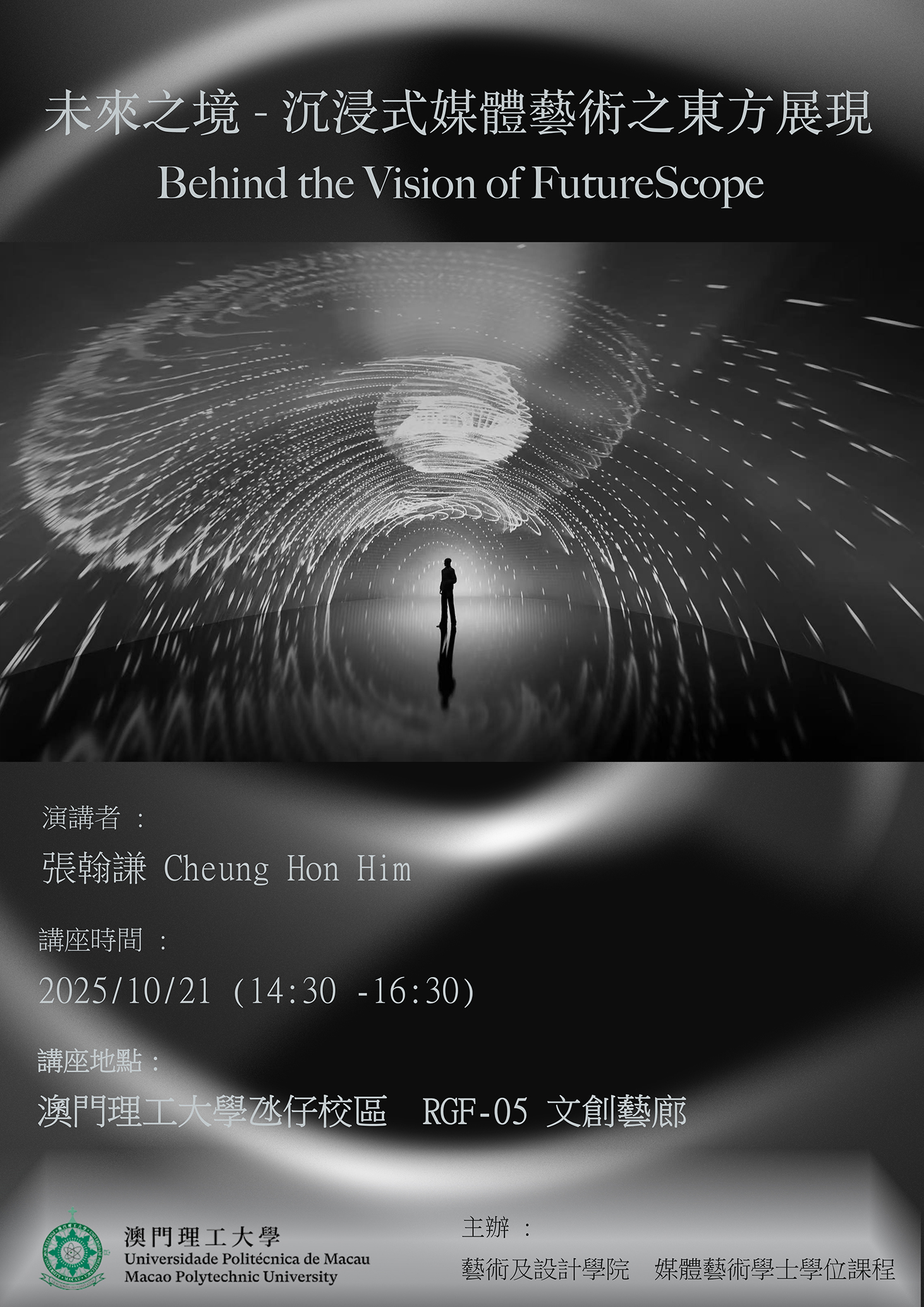 本次講座邀請新媒體藝術家張瀚謙,分享如何透過沉浸式科技與藝術結合,將水墨、書法與大自然融入,展現東方美學魅力。張瀚謙將分享其在香港首個大型藝術穹頂「FUTURESCOPE」的創作歷程,從概念到實現的過程中,如何與國際藝術家合作以及策劃節目。學生將透過此次講座,深入了解創新、藝術與建築融合所帶來的全新觀眾體驗。