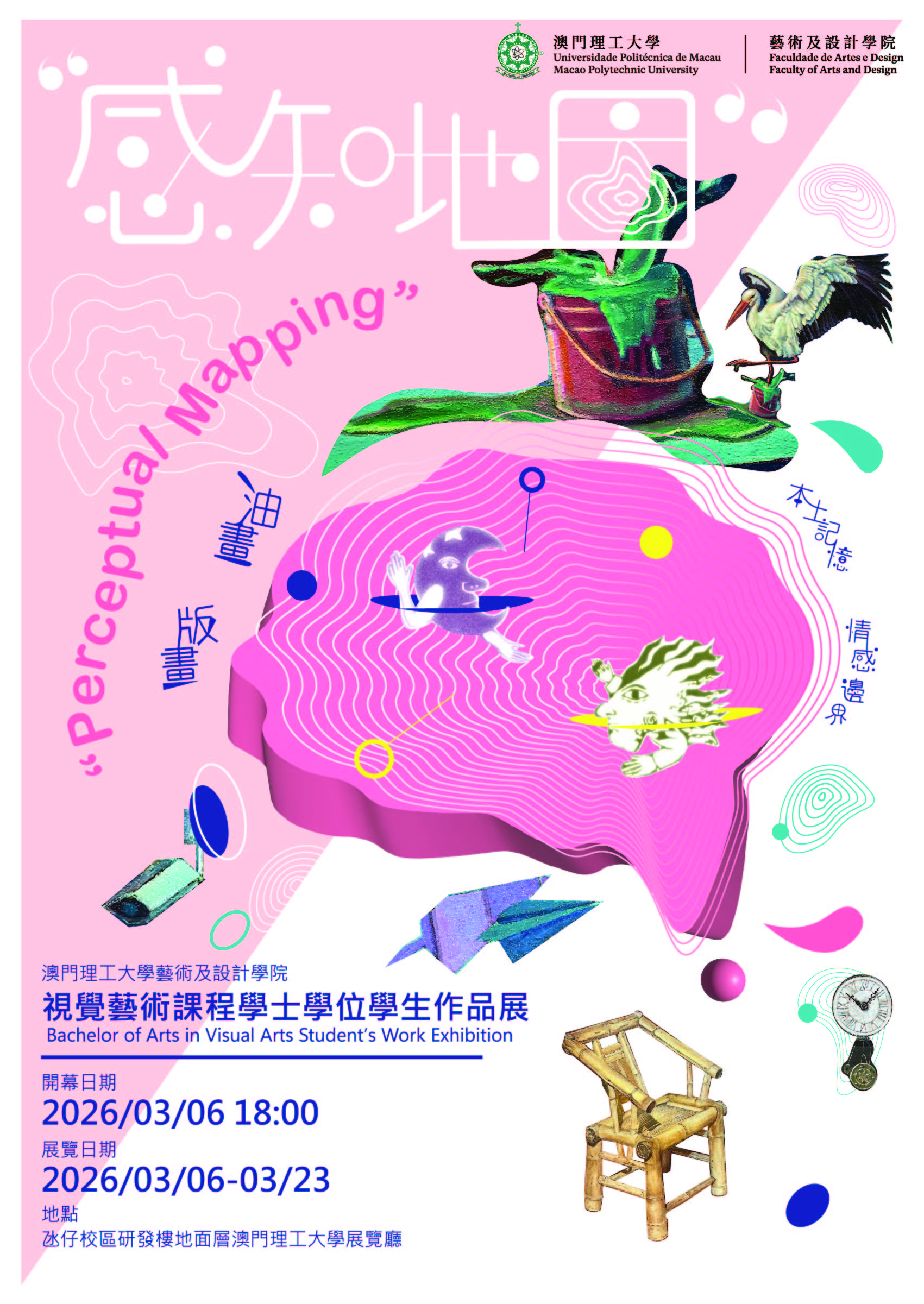 本次展覽將以「感知地圖」為主題,呈現視覺藝術專業學生在地方經驗與個人內在情感創作的探索成果。透過<本土記憶> 與 <情感邊界>兩個單元,展覽挑選學生在油畫及版畫學科中關注文化環境與情感經驗兩個層面的優秀作品,呈現學生如何通過圖像成為感知與思考的媒介。