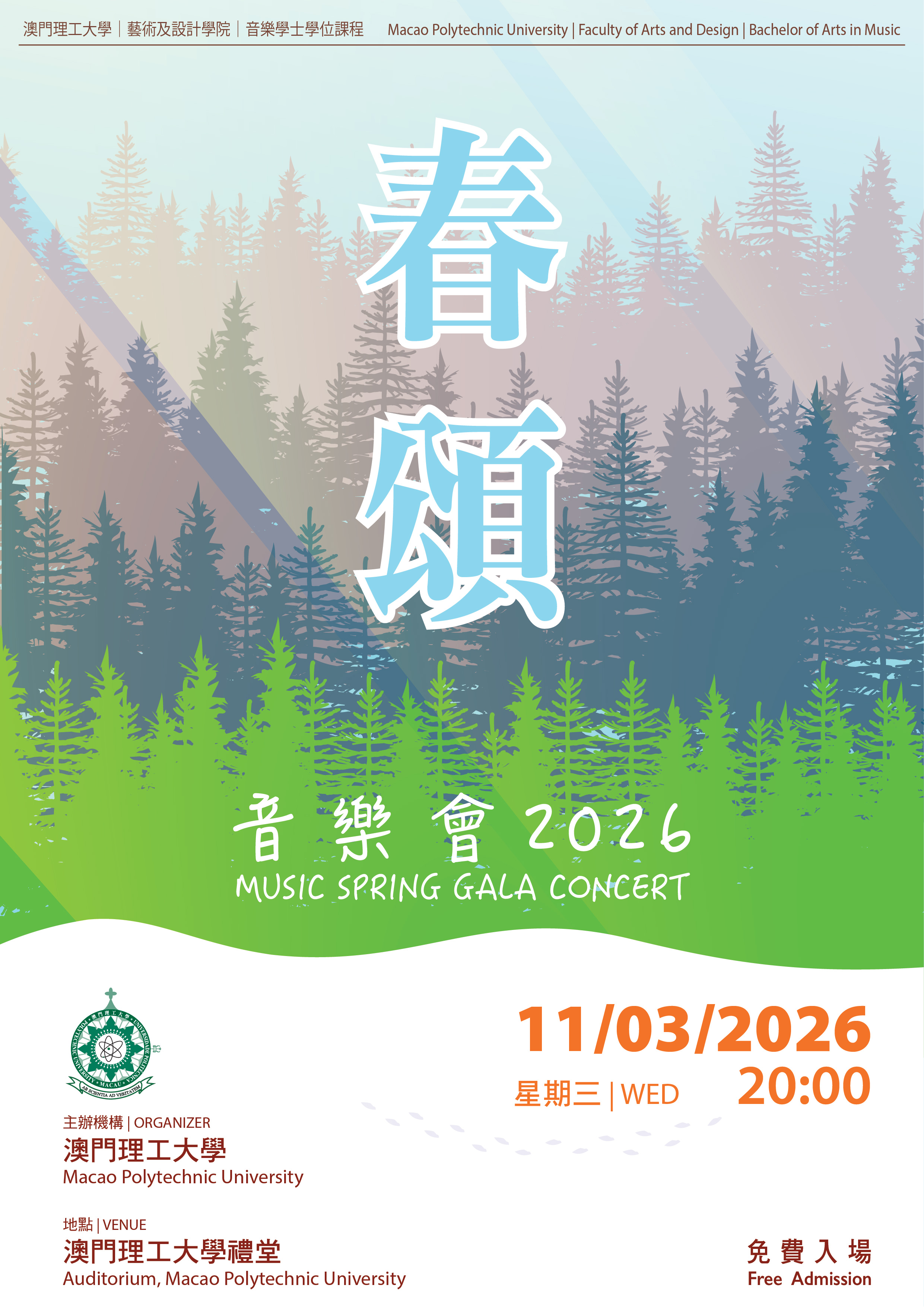 為推動藝術教育、豐富校園文化,音樂學士學位課程每年春季均舉辦「春頌音樂會」以展現學生之學習成果與藝術才華,2026年之春頌音樂會定於3月11日晚上八點於澳門理工大學禮堂舉行。本次音樂會之曲目經過精心挑選,呈現多元音樂風貌,將涵蓋聲樂作品,以及中西器樂之獨奏與合奏演出。期望透過不同時期、不同風格之作品演繹,展現學生於演唱技巧、器樂演奏及團隊協作方面之綜合能力。音樂會將為學生提供一個實踐舞台,並促進音樂藝術於校園內外之交流與推廣。