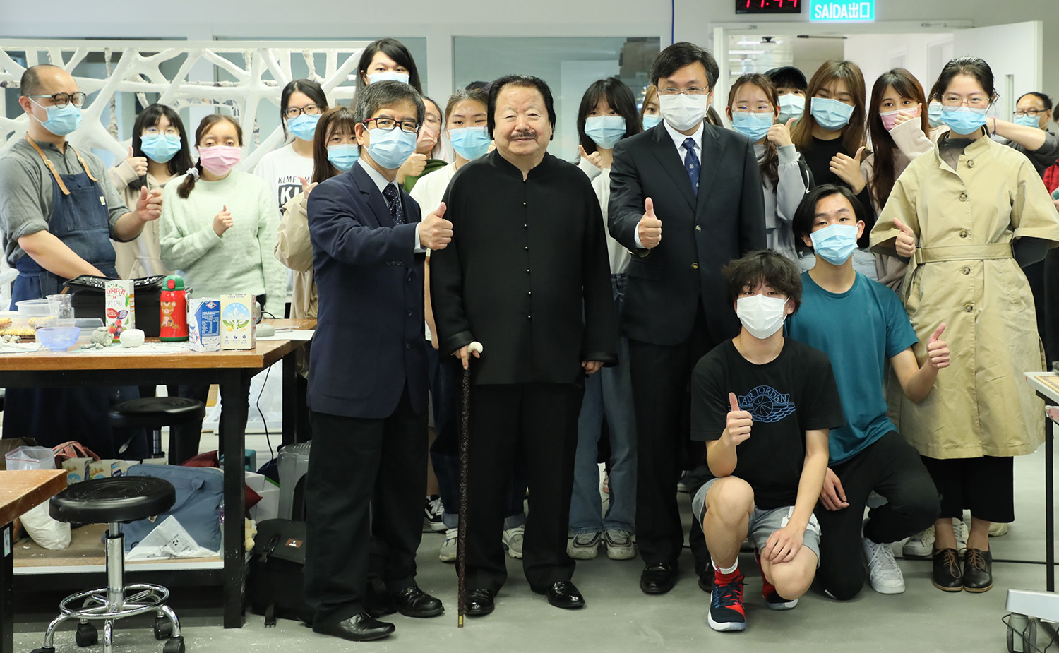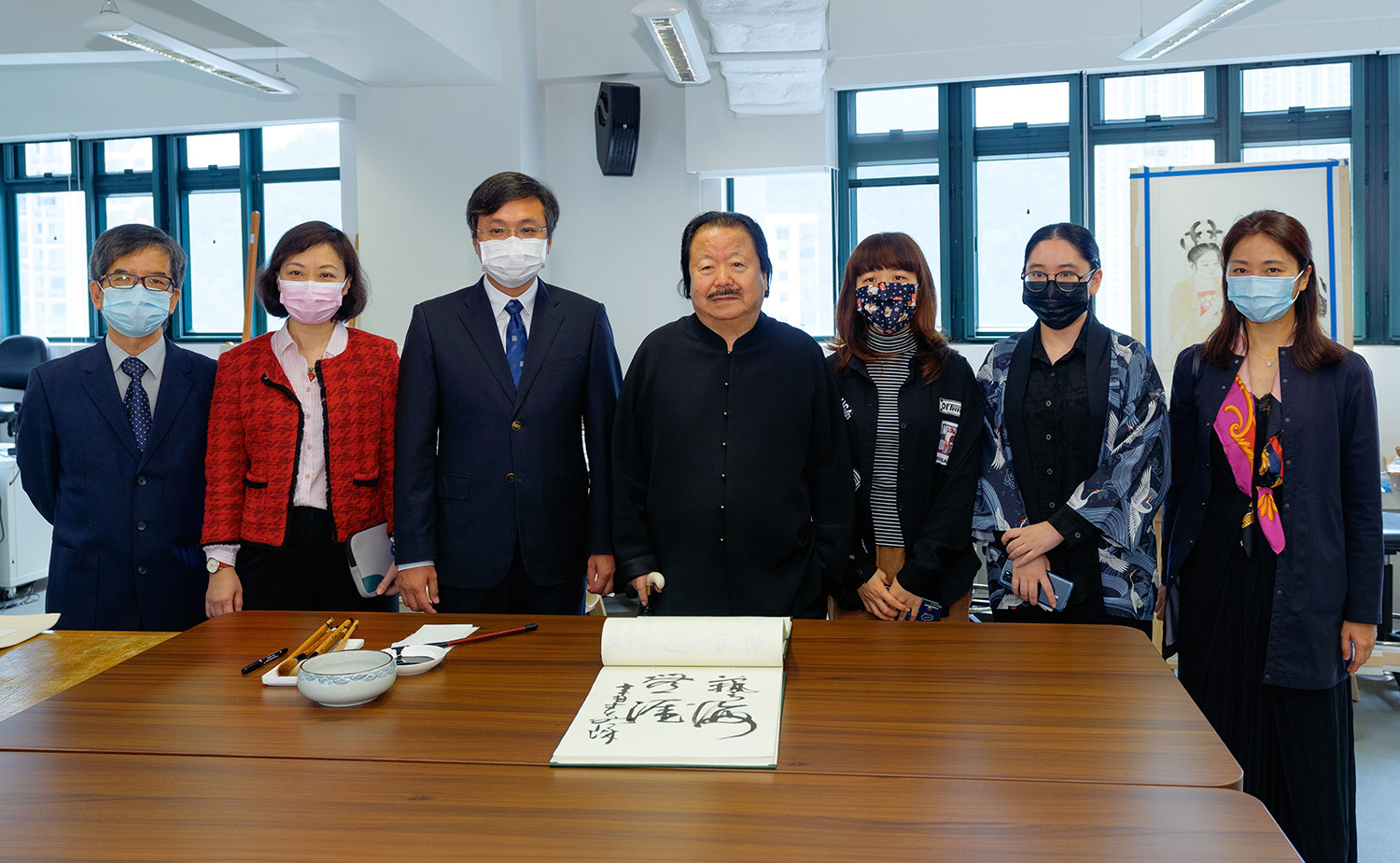 The artist, accompanied by other guests, visited MPI's School of Arts, Cultural and Creative Industries Teaching and Research Centre, the professional facilities of the Visual Arts Programme, including the Drawing Studio, the Printmaking Studio, the Sculpture Studio, the Ceramics Studio and the Photography Studio, etc. The teachers and students also presented the teaching and learning achievement to the guests. The event of the famous artist's visit to MPI was attended by the advisor of the Office of the Secretary for Social Affairs and Culture of the Macao SAR Government, Lo Hou Chi; the President of the Cultural Affairs Bureau of the Macao SAR Government, Mok Ian Ian; the head of Department of Exhibition and Museums of the Cultural Affairs Bureau of the Macao SAR Government, Sam Hou In; the Vice President of MPI, Lei Ngan Lin; the Acting Director of the School of Arts, Lai Ming Hoi; the Director of Cultural and Creative Industries Teaching and Research Centre, Wen Kuo-Hsun; the Programme Coordinator of the Bachelor of Arts in Visual Arts of MPI, Chang Sow-Wei and other guests.