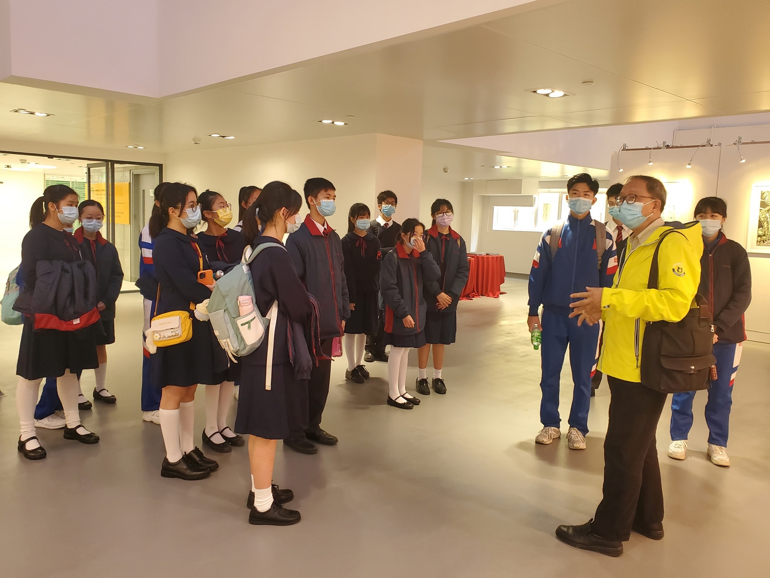 A delegação da Escola Secundária Pui Ching, liderada pela professora Wong Wai I, visitou o campus do IPM na Taipa para assistir à exposição, tendo sido recebida pelo Professor Sou Pui Kun, do Curso de Licenciatura em Artes Visuais, que lhes proporcionou uma visita guiada. A seguir, a delegação visitou várias salas de aula de arte e estúdios profissionais, para que os alunos da Escola Pui Ching pudessem ter uma experiência pessoal sobre a diversidade e o profissionalismo das disciplinas de artes visuais, alargando os seus horizontes artísticos.
