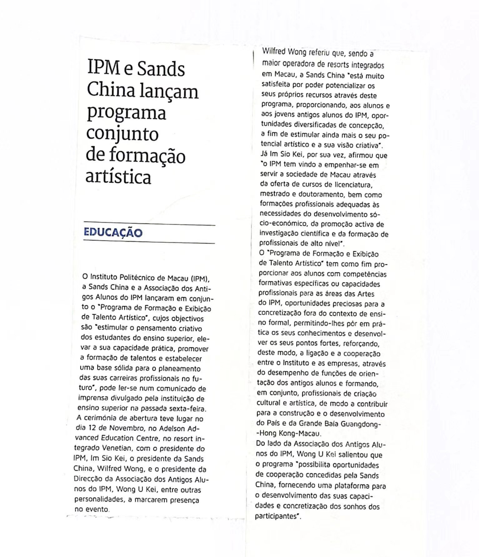 Com o intuito de se aumentar a competitividade entre os estudantes do ensino superior e os jovens, assim como desenvolver o planeamento das suas carreiras profissionais, o Instituto Politécnico de Macau, a Sands China e a Associação dos Antigos Alunos do Instituto Politécnico de Macau lançaram em conjunto o “Programa de Formação e Exibição de Talento Artístico (Art Talent Development Showcase)”, cujos objectivos são estimular o pensamento criativo dos estudantes do ensino superior, elevar a sua capacidade prática, promover a formação de talentos e estabelecer uma base sólida para o planeamento das suas carreiras profissionais no futuro. A cerimónia de abertura teve lugar no dia 12 de Novembro, no Adelson Advanced Education Centre, Venetian Macao. O presidente do Instituto Politécnico de Macau, Im Sio Kei, o presidente da Sands China Ltd., Wilfred Wong, e o presidente da Direcção da Associação dos Antigos Alunos do Instituto Politécnico de Macau, Wong U Kei, entre outros, estiveram presentes no evento e presidiram à cerimónia de abertura do mesmo.