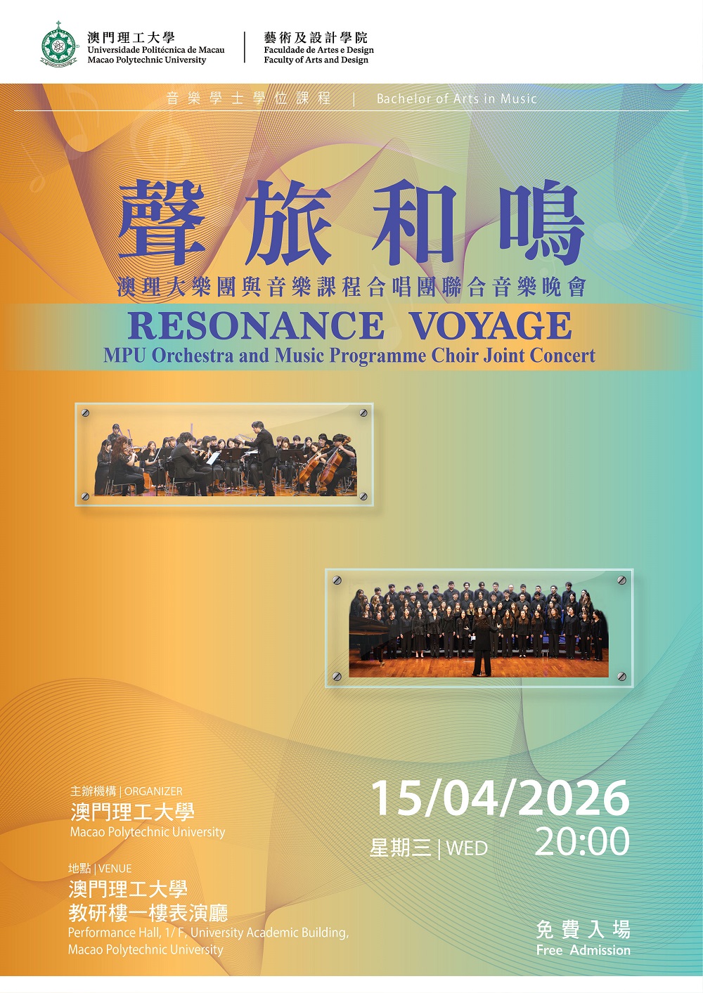 為促進校園藝術文化交流、展現學生多元音樂才華,澳門理工大學樂團與音樂課程合唱團將於本年4月15日攜手舉辦一場聯合音樂會,音樂會上半場由合唱團開展,演出曲目涵蓋拉丁文聖樂、英文音樂劇經典、客家民謠及廣東話作品等多樣風格,透過語言與曲風的交融,展現合唱團的多元表現力,下半場則由樂團接棒,演奏多首跨越古典、爵士及現代等不同類型的器樂作品,以豐富的編曲與層次呈現樂團的演奏實力與音樂創造力。音樂會旨在打造一場聽覺與文化的旅程,為觀眾帶來一個跨越地域與時代的音樂晚上。