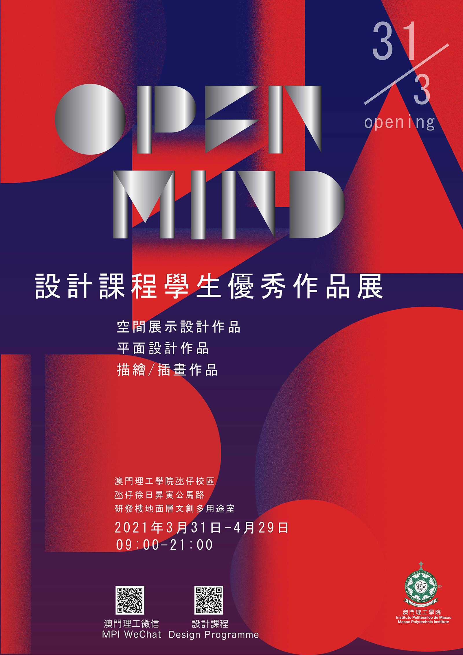 展覽於3月31日舉行開幕儀式,由澳門理工學院藝術高等學校副校長黎明海,聯同設計課程師生出席。現場展出學生優秀作品近百項,題材內容和設計領域多元豐富,包括:平面設計、插畫描繪、數碼媒體設計及空間展示設計等。