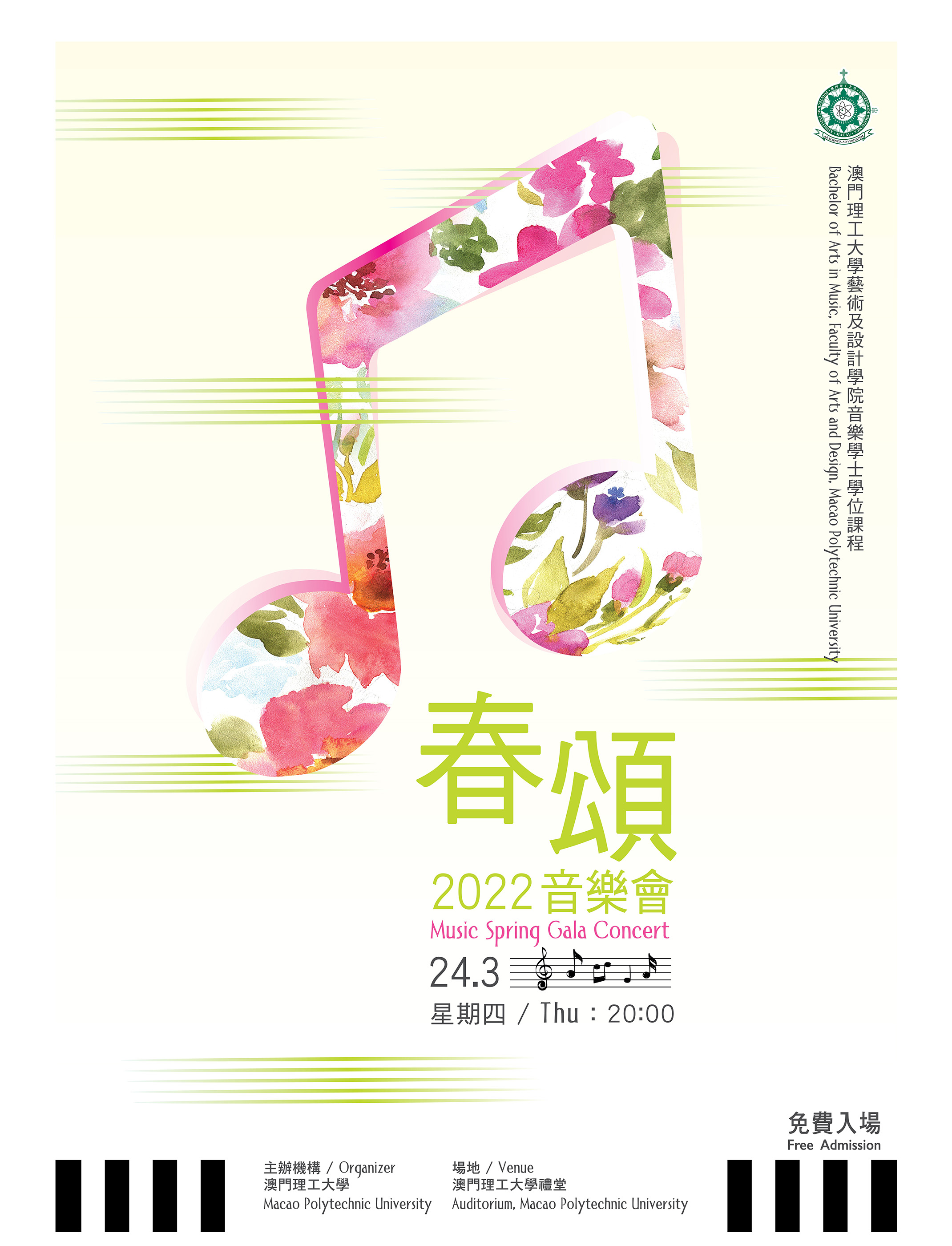 澳門理工大學藝術及設計學院主辦的“春頌”音樂會,將於3月24日晚上八時,在該校禮堂舉行,主要由音樂課程學生擔綱演出,透過多首中西樂曲展現青春風采,並向社會展示教學成果,呈獻充滿青春氣息的音樂盛宴,精彩可期。