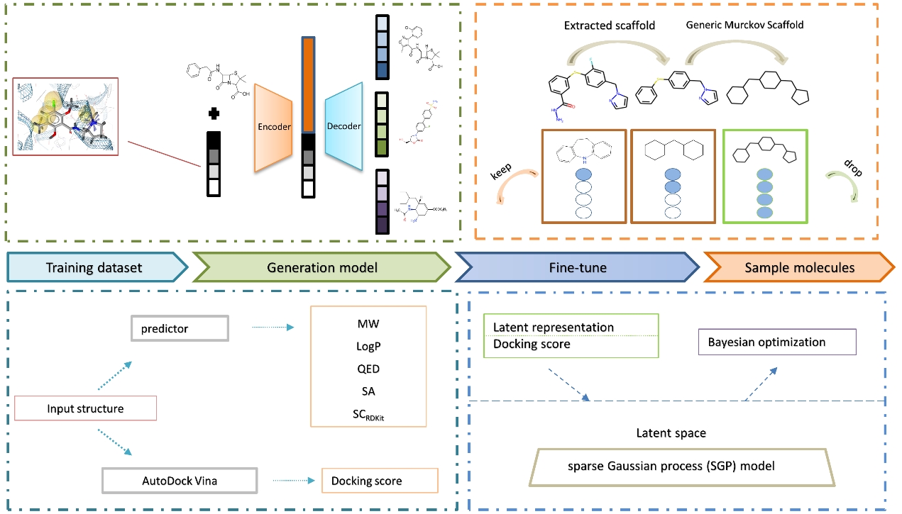 The approach employs a ligand-centric generation model that matches the pharmacophores of active compounds to iteratively search the entire chemical space, selecting compounds with higher affinity for the target. The molecular generation model is primarily constructed based on a multi-objective conditional variational autoencoder, which simultaneously constrains synthesizability, drug-likeness, and other relevant physicochemical properties during the search process in chemical space, thereby increasing the potential of generated molecules. Molecular docking guides compound optimization, combining docking scores with Bayesian optimization for model fine-tuning, resulting in potential candidate molecules with high affinity for specific targets. During the fine-tuning process, the model also incorporates a similarity scaffold filter, aiding in obtaining more diverse molecular structures during chemical space exploration.
