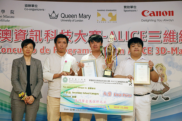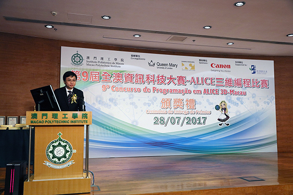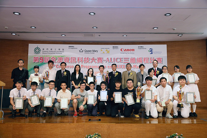 The ‘9th Macao-wide IT Competition – ALICE 3D Programming Contest Awards Ceremony’ was held at MPI on 28th July where the officiating guests in attendance were Professor Lei Heong Iok, President of MPI; Ms. Tam Van Iu, Acting Deputy Director of the Macao Post and Telecommunications Bureau; Ms. Lai Iok In, Division Head of the Education and Youth Affairs Bureau, and Mr. Guo Gui, principal representative of Canon Hong Kong Company Limited (Macao Branch). Winners of this contest, their teachers and representatives from the respective secondary schools were also present at the ceremony.