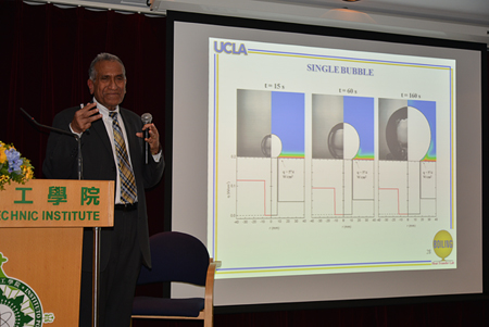 Dhir教授再次肯定理工的教學及研究的質量,並邀請澳門理工於美國加州大學洛杉磯分校建立聯合實驗室。鑑於兩間院校在教學及科研項目的合作上已取得佳績,雙方均表示有意願開展更多科研合作項目。同時,Dhir教授亦與該課程的學生進行了深入的交流,並了解一些有潛力的理工學生的背景及即場進行指導,以利他們日後到美國升讀碩博士班。同時,Dhir教授為澳門理工學院學生進行了一場專題演講,題目為"Mechanical Engineering Effect of Gravity on Boiling Heat Transfer"。是次專題演講主要講述沸騰熱轉移機理在不同的重力環境下的表現。在專題演講中,Dhir教授輔以不同的3D模擬動畫進行詳細解釋,再加上精密的實驗及電腦模擬數據,在場的學生均認為從是次演講中獲得不少的專業知識,對於提升自身專業水平非常有幫助。