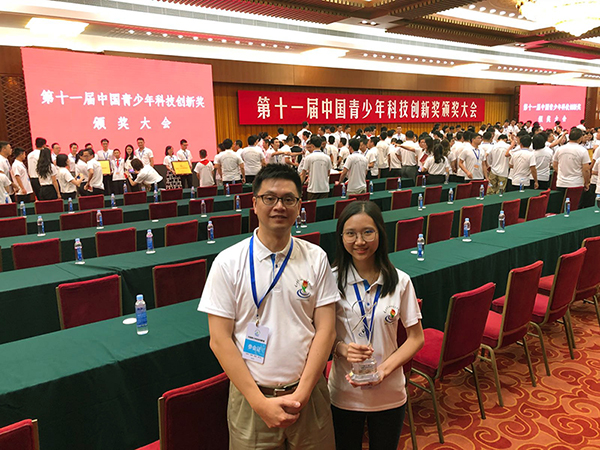 第十一屆“中國青少年科技創新獎”獲獎同學林彩月(右)與指導老師鄧樹傑