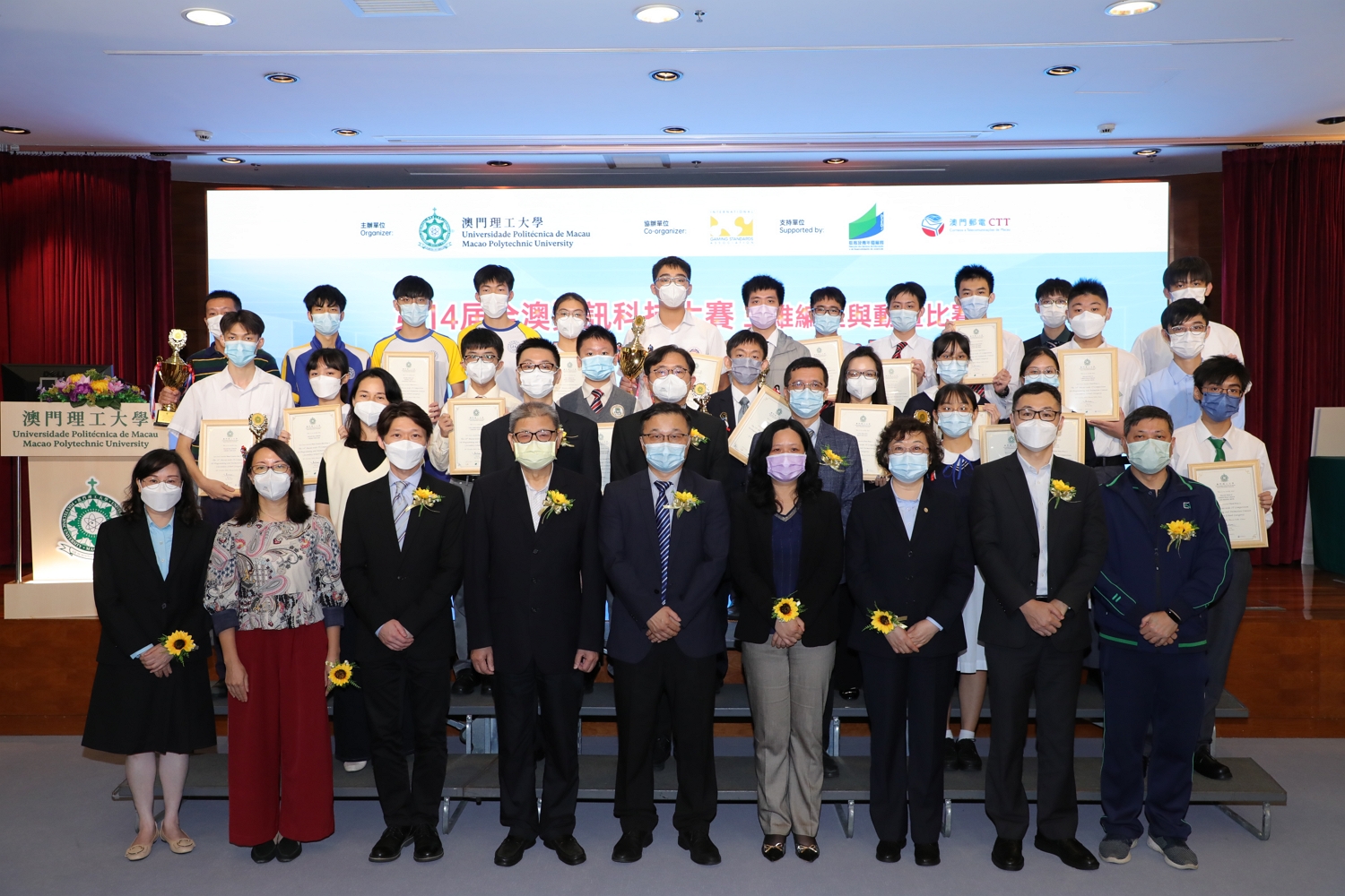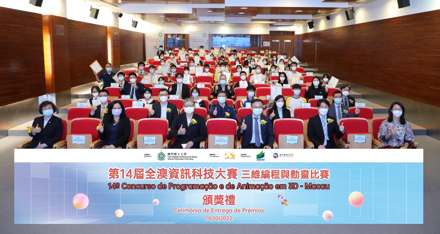 由澳門理工大學主辦、國際博彩標準協會(iGSA)協辦、澳門特區政府教育及青年發展局和郵電局支持的“第十四屆全澳資訊科技大賽–三維編程與動畫比賽"頒獎禮日前在澳門理工大學舉行,由澳門理工大學應用科學學院代院長林燦堂、廣東省工程師學會榮譽會士暨澳門電腦學會會長溫錦明、郵電局資訊科技發展及資源管理廳廳長葉智勤、教育及青年發展局資訊及科技處處長黎玉燕、利瑪竇中學校長張慧玲、勞校中學副校長邵朝霞、澳門菜農子弟學校副校長譚錫添、副校長江欽育和聖保祿學校副校長彭碧欣等主禮。本屆比賽報名踴躍,有過百隊參賽隊伍共三百多人報名參賽。