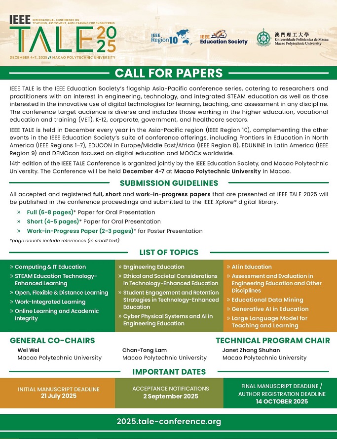 IEEE TALE 2025教育研討會將於12月4日至7日於澳門理工大學舉行。作為IEEE教育協會(IEEE Education Society)在亞太地區的旗艦年度會議,TALE 2025教育研討會聚焦工程、技術與跨學科 STEAM 教育,並探索數位科技在學習、教學與評估方面的創新應用,旨在促進教育科技領域的學術交流與實踐經驗分享。現誠邀全球學者及從業者投稿參會。